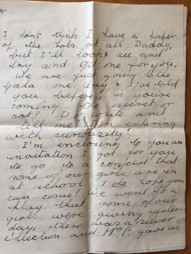I’m enclosing to you an invitation I got for you to go to a concert that some of our girls are in at school. I do hope you can come! We went to a play that some of our girls were giving yesterday, there was a silver c’llection and Mrs. P. gave us each a 6’, I ‘spect it will be on the bill. It was awfully good and there was a little play and some dances, and the chorus with actions sung ‘Misery Farm’ and ‘It goes like this’! It was lovely.