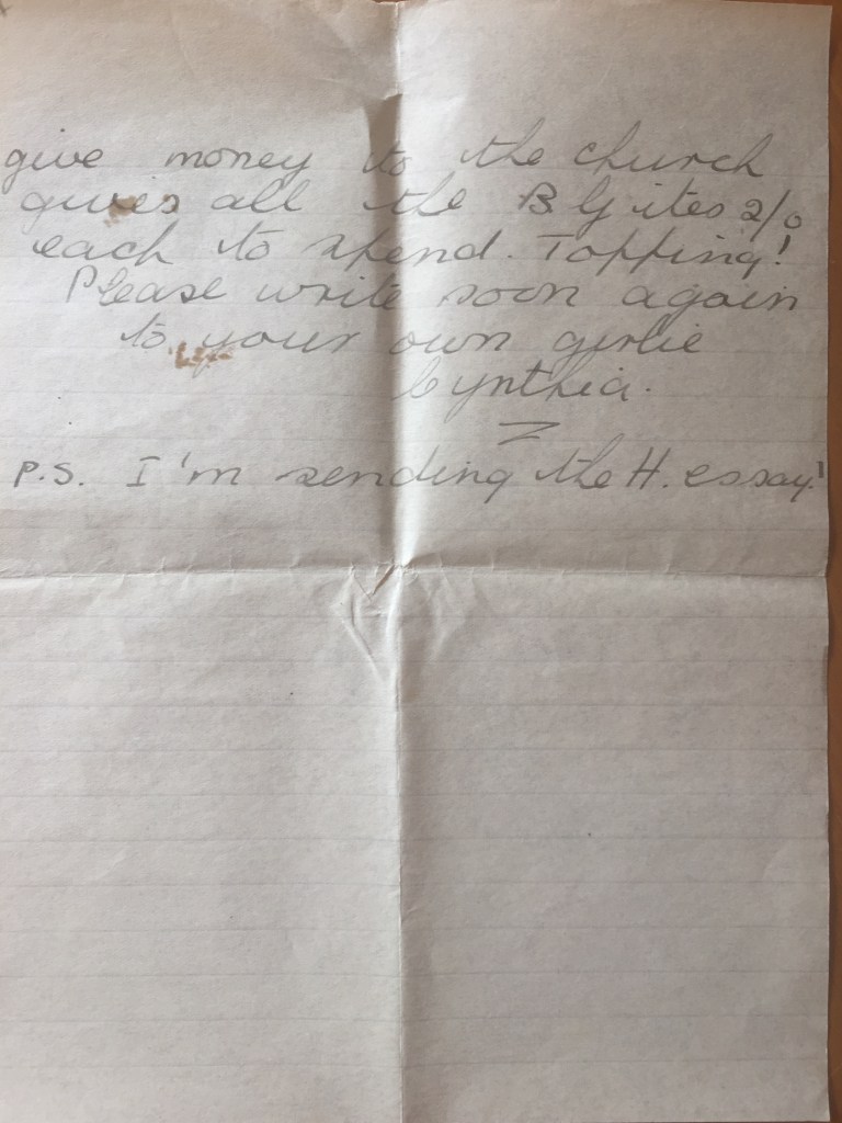 This rather giddy letter shows that Cynthia has adjusted to her new school and is feeling happy! I think some of the things mentioned in the letter- the ring, the Exhibition her parents have gone to in Newcastle, and the suggestion that relatives will be visiting from overseas- are the factual events she based her story ‘Jack’s Visit’ on. (See earlier post.)