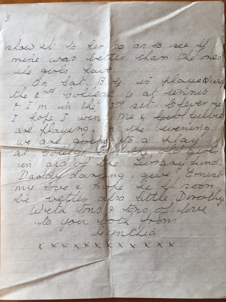 On Sat. B.G. is playing the 2nd College 6 at tennis & I’m in the 3rd set. Clever me! I hope I win! Me & Gilbie are playing. In the evening we are going to a play at College by the old girls in aid of the Library fund. Daddy darling, give Ernest my love & hope he’ll soon be better also little Dorothy.