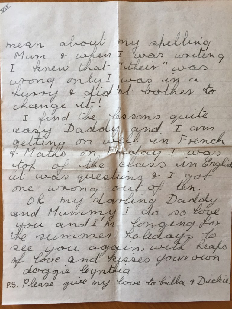 OK my darling Daddy and Mummy I do so love you and I’m longing for the summer holidays to see you again, with heaps of love and kisses your own doggy Cynthia.