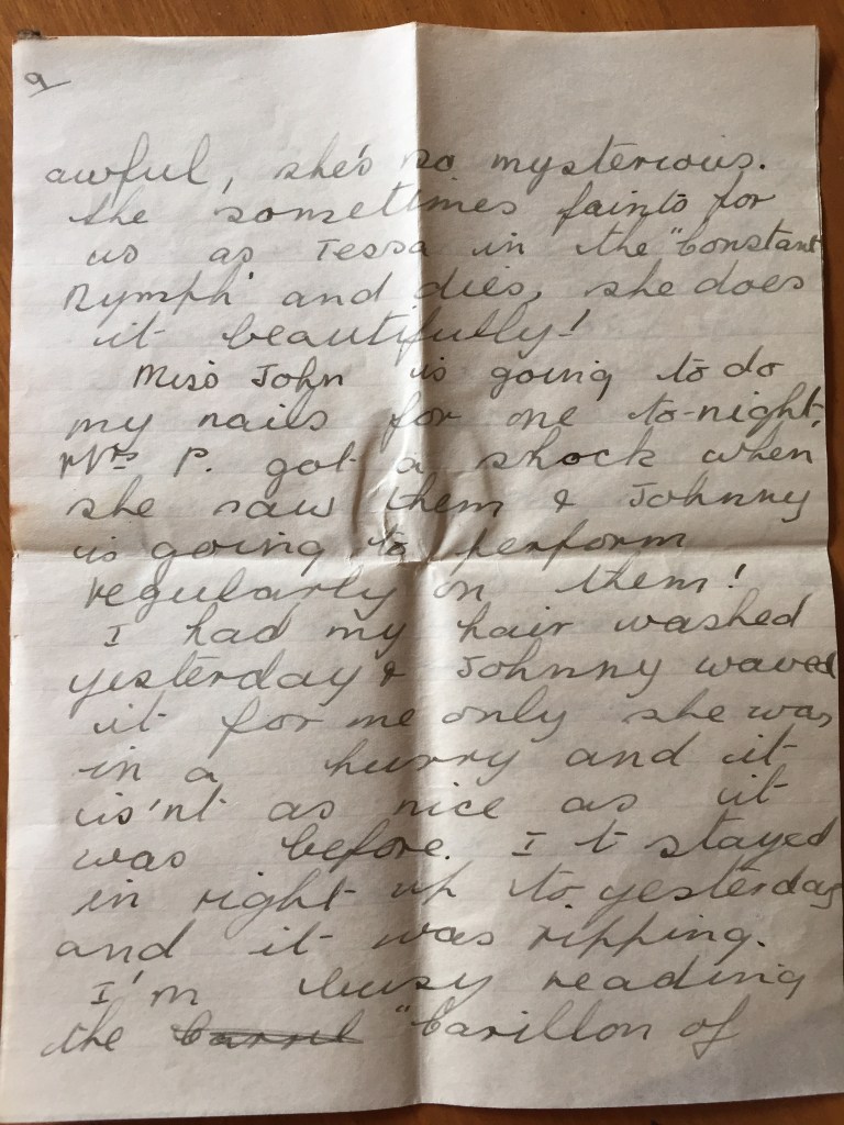 Miss John is going to do my nails for me tonight, Mrs. P. got a shock when she saw them & Johnny is going to perform regularly on them! I had my hair washed yesterday and Johnny waved it for me only she was in a hurry and it is’nt as nice as it was before. It stayed in right up to yesterday and it was ripping.
