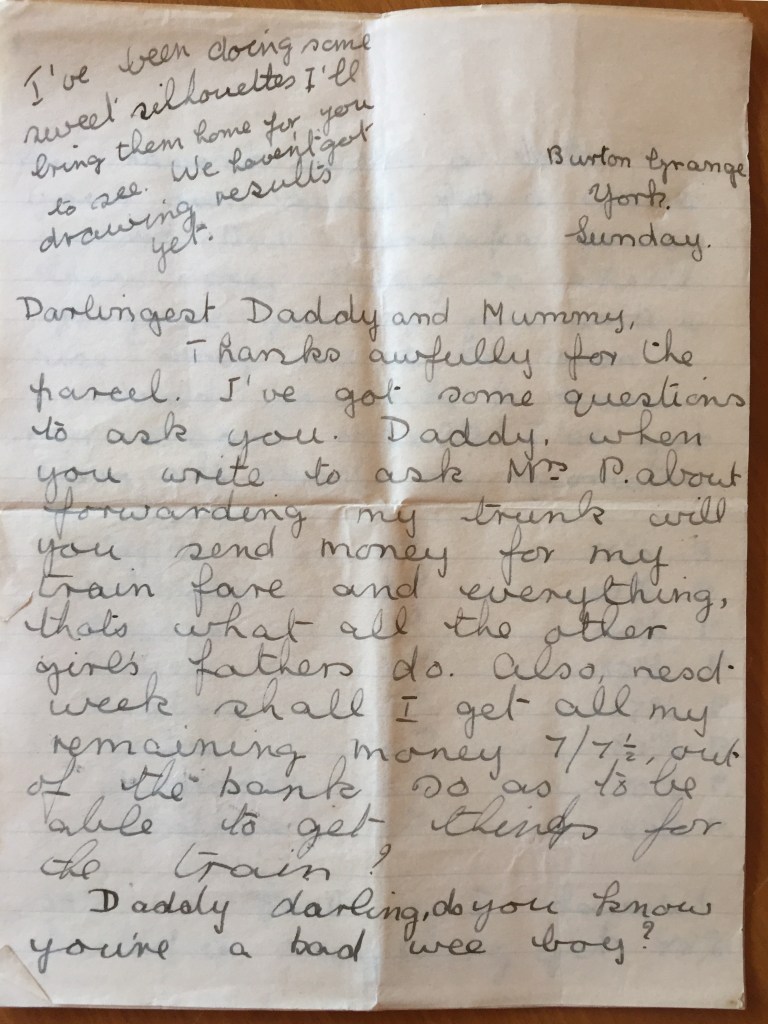 Thanks awfully for the parcel. I’ve got some questions to ask you. Daddy, when you write to ask Mrs. P about forwarding my trunk will you send money for my train fare and everything, that’s what all the other girl’s fathers do. Also, next week shall I get all my remaining money, 7/7 1/2, out of the bank so as to be able to get things for the train?
