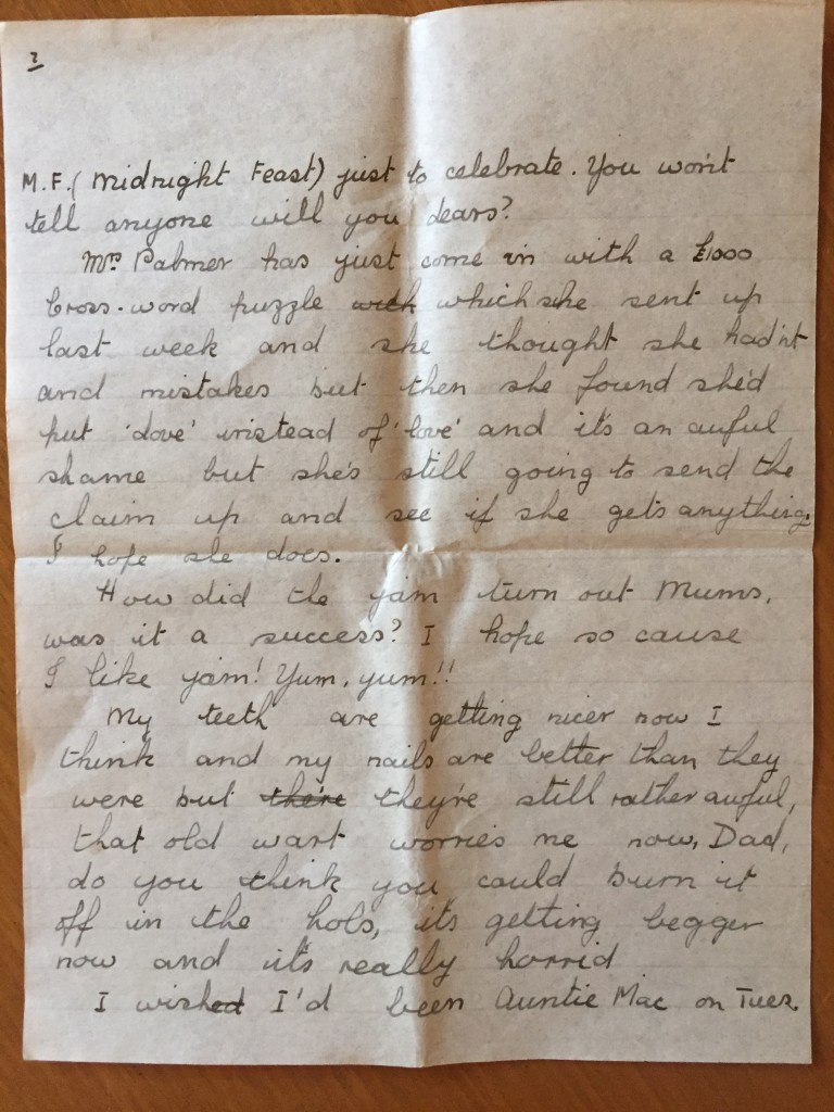Please do send another parcel soon Mum but not till the end last Sat: Mums dear, because as heaps of the girls are leaving we are going to have an M.F. (Midnight Feast) just to celebrate. You won’t tell anyone will you dears?