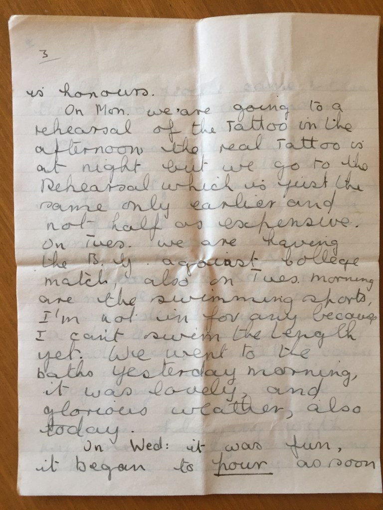On Mon. we are going to a rehearsal of the Tattoo in the afternoon, the real Tattoo is at night but we go to the Rehearsal which is just the same only earlier and not half as expensive. On Tues. we are having the B.G. against College match, also on Tues. morning are the swimming sports, I’m not in for any because I can’t swim the length yet. We went to the baths yesterday morning, it was lovely, and glorious weather, also today.
