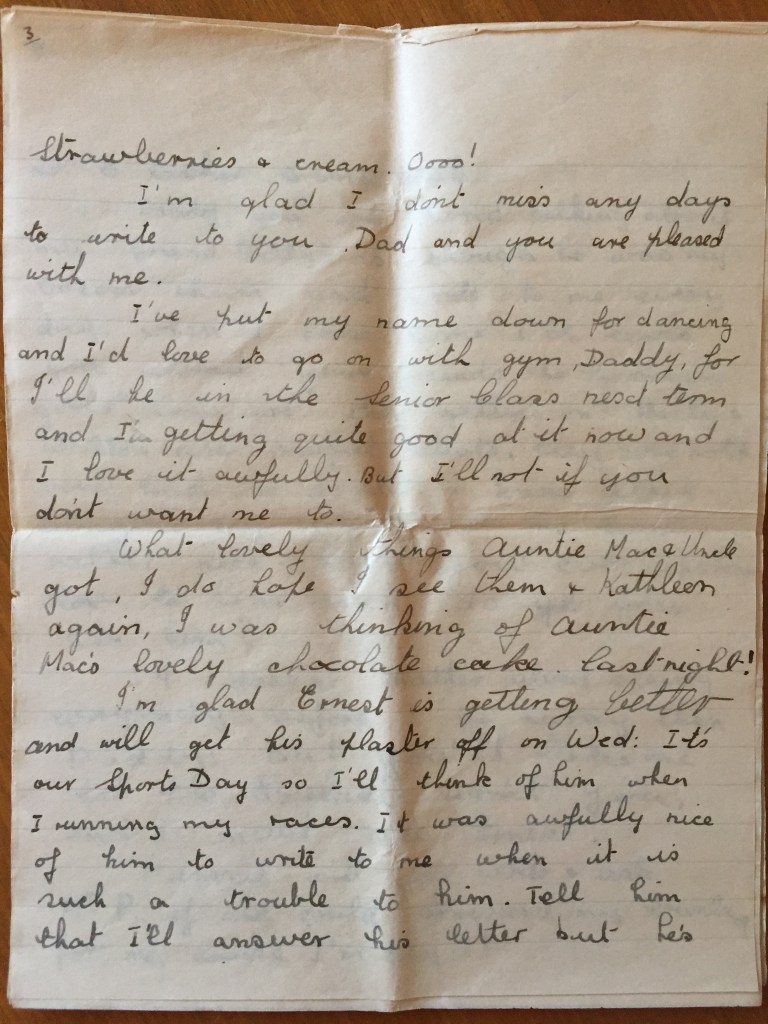 I’ve put my name down for dancing and I’d love to go on with gym, Daddy, for I’ll be in the Senior Class next term and I’m getting quite good at it now and I love it awfully. But I’ll not if you don’t want me to.