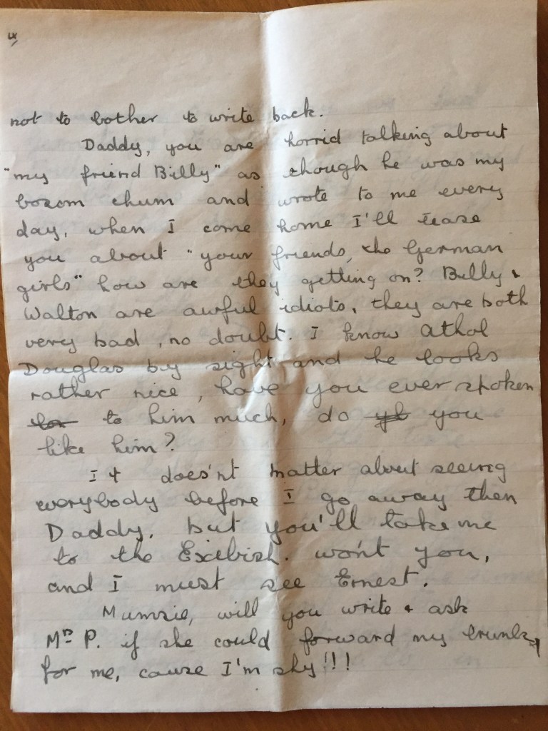 Daddy, you are horrid talking about “my friend Billy” as though he was my bosom chum and wrote to me every day, when I come home I’ll tease you about “your friends, the German girls” how are they getting on? Billy & Walton are awful idiots, they are both very bad, no doubt. I know Athol Douglas by sight and he looks rather nice, have you ever spoken to him much, do you like him?