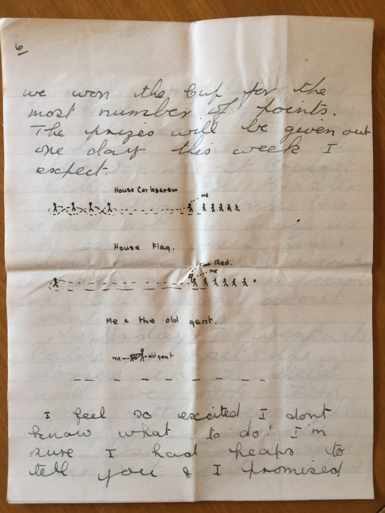 We’ve just run off the Sports Heats but I didn’t go in for any because I had to be a senior and there weren’t any nice ones. But you know I’ve been put into St. Georges, the Red House, and I’ve been chosen for one of the first six in the Relay Race, a great honour for little me.