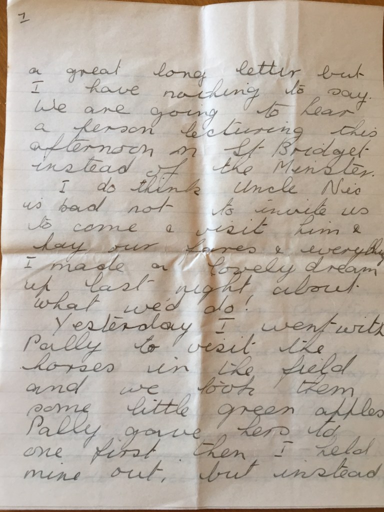 Yesterday I went with Pally to visit the horses in the field and we took them some little green apples. Pally gave hers to one first then I had mine out, but instead of eating the apple it ate my fingers and so I dropped it, and Pally had to give them mine. I’ve written to ask May if she’ll come for me next Sunday as it’s my last Sunday & I have that book to give back to her. I hope she will.