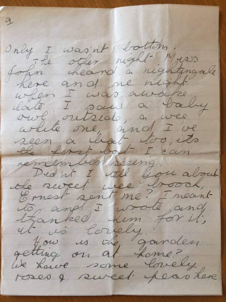 The other night Miss John heard a nightingale here and one night when I was awake late I saw a baby owl outside, a wee white one, and I’ve seen a bat too, it’s the first bat I can remember seeing. Didn’t I tell you about the sweet wee brooch Ernest sent me? I meant to and I wrote and thanked him for it; it is lovely.