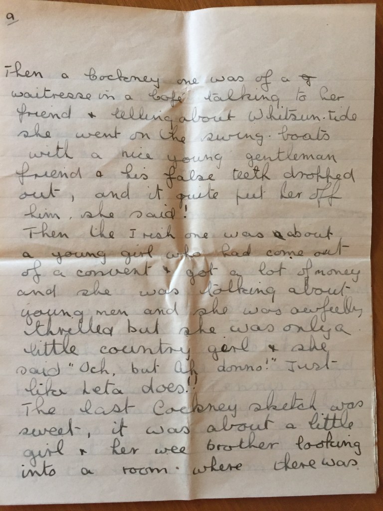 Then the Irish one was about a young girl who had come out of a convent & got a lot of money and she was talking about young men and she was awfully thrilled but she was only a little country girl & she said “Och, but Ah dunno!” Just like Leta does!! [Leta was a Ewing cousin her age, who lived in Ireland]