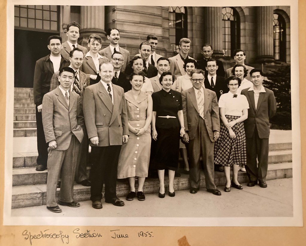 The Spectroscopy Section had their photograph taken on the steps of the N.R.C. on Sussex Drive, with Dr. Herzberg in the front row wearing glasses, and Cec the tallest in the back row left.
