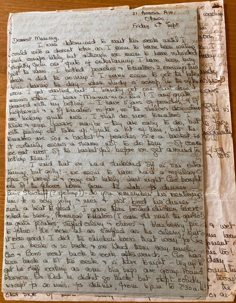 I was pretty worn out by then, as on the Sunday we had had June Lindsay and her friend Margaret to tea, & then gone to Dr. and Mrs. Herzberg’s in the evening. I don’t think I told you have poor June & her customary bad luck with George! Anyway, just as her Mother left, this friend from England, Margaret, arrived to stay with her. She is a very pretty, quiet-mannered girl & both Cec & I think nicer & easier than June herself! She was to stay with them in Ottawa, but the first week the 3 of them were going to a place Manitoulin Island (in a lake) for a holiday. However, George ofcourse got sent to Boston at the last minute! His holiday just cancelled with no warning & the 2 girls had to go off to this place on their own. You can imagine how fed up June was, & to add to their misfortunes, on their arrival back in Ottawa afterwards, Margaret stepped off the train onto a rut in the platform & sprained her ankle very badly! It had to be x-rayed etc. and then kept up for days & altogether put another damper on their proceedings! George was away all this time & only was coming back 4 days before Margaret left for England, so altogether poor June was fed up. I went over to tea with them the previous Tues. with Lindy & was so sorry for them that I said they must come to tea on Sunday & we would take them a little drive around. By the Sunday, however, they seem to have been about quite a bit, but we drove them along the Aylmer Rd. & then back via the Champlain Island where we had ice cream cones- June probably thought it very plebeian!! We had quite a rush to get to the Herzie’s after taking them home & having dinner, but we managed & had a very nice evening- the conversation was quite general & interesting & I really enjoyed meeting all the different people.