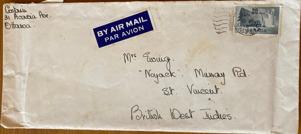He was tired after his night in the train, and they were off to Montreal early in the morning so we drove him back to the Château soon after 8 o’clock, and this suited me fine as I didn’t want to keep the children out too long. It really was nice seeing him again and he seems very contented with his life now. I suggested he try a trip to the West Indies, and he said that you had said so too, and he seemed quite interested so you might be seeing him next! On the Tuesday Fanni had very kindly invited us all to a barbecue supper, so this was a lovely free day for me, without even dinner to prepare. Unfortunately it was as changeable as all this peculiar summer has been, and about 4 it clouded over and began to pour with rain, so we couldn’t sit outside doors after all. Teddy has built a lovely new fireplace outside and we were going to christen it but we had a nice time anyway. Talking of christenings the Bowen’s smallest girl, Patty, aged four had me very puzzled the other Sunday – she kept telling me that she was going to – – – – and that I should come to this – – – – and there would be nice things to eat! I couldn’t make out what the word was and asked her again and again and finally got it – a “bastism”! Next day, Wednesday, I set out on my trip to Montreal. I gave the children their lunch and arranged for them to go to Mrs. Lockwood’s after school, and then dashed around and did a few chores before I set out at 9 o’clock. It was really a perfect day for driving, as it was sunny but quite cool, so I wore the navy and white checked outfit you helped me buy before you left, and my pink straw pillbox hat. I took just about the three hours to drive the 120 miles, and felt very proud of myself as I only got lost once in the city, and then I drove in onto a side street and found myself on the map! I found a parking lot very near the bus station and was there at 12:05 to find Mary just arriving. She looks practically exactly the same – no gray hairs and just about the same figure, but of course her complexion is 10 years older, like mine! We set off and found an Italian Restaurant nearby, and decided to take our time, and ordered a bottle or rather a half bottle of white wine and sat there sipping and talking and eating for two hours. We showed one another pictures of our children and told one another about our families, and caught up on our friends and their children and had a thoroughly good time! Mary had stayed one night with Olwen and Noel in Vancouver (3 children) and I was wrong – I thought Noel was a teacher but he is with an advertising firm. I was very amused because apparently they loathed Canada to begin with and a few years ago went back to England, and although they both worked there they couldn’t make enough money to live on! Not, I gather, in the style to which they would like to be accustomed! So they returned to Canada, but for Mary’s few remarks it sounds as if Owen is still quite affected. Mary’s mother and Gerard were meeting her at Prestwick, and Gerard was lending her his car, so she hopes to get around and see everyone. She is then going home via Rome, and Gerard will go there with her, and then she goes on to Singapore and so home. She has left the 2 girls in a convent boarding school where Ann already goes, but the young one just for the term, and the three boys and Michael are looking after each other. She seems to have very much the same kind of life as I do I think, and seems very contented. After our long lunch we went and looked at the shops a bit and I got some candy to take back to the children and Mrs. Lockwood, and then before long it was getting on for 4 o’clock. I wanted to leave before the evening traffic rush began, and Mary wanted to be back before too late as she was staying with a young English couple, so we had a cup of tea and said goodbye and I was home soon after 7. My activities still weren’t over though, as this was the evening of Mr. Bowen’s presentation, so I got tidied up a bit, and then went over to the Lockwood’s and took Mrs. L and Linda and Charlie down to the Church. There has been a great mix-up over the parish letter telling the people about the Bowens’ leaving and asking for subs. etc. – in fact it was never sent, and in the end the Wardens had to ask some of us in the Guild to phone everyone, so we were quite relieved to find there was quite a nice crowd there. The Guild served tea and coffee and cookies, and then the gifts were presented – very nice leather briefcase to Mr. Bowen and a set of dishes to Mrs. Bowen and a cheque ($100). The dishes were exactly the same as my blue Wedgewood, but yellow as Mrs. B wanted those, but I didn’t think they were as pretty as mine. We also gave a cheque to Mr. Trumbull the organist (Mrs. Rothwell’s lodger – remember?) as he wouldn’t accept a salary apparently. He is leaving Fairfield School so of course leaving Mrs. R and the Church too. I didn’t stay to the end of the social as I had the children, but it was quite pleasant and I think that the Bowens were pleased. Next morning I blessed Mary Orr, as this was the day that she had talked me into going and helping her with this lunch. The Save the Children have a Dog Show every year apparently at Ashbury College and Mary and some of the other women provide and serve lunch for the dog show judges. It really wasn’t hard work, as I had to be there at 11, and about 4 of us set up card tables and then one long buffet table table with the food on it – all cold- in the gym. We served about 25 people and then had our own, but had no washing up or anything, and as they all trickled in a few at a time there was no rush. I left about 2, and went to the Coinwash and did my washing! Did I tell you that the washing machine had passed out? Cec says the motor has burned out and we don’t feel inclined to spend $50 or more for it, so we have decided to leave it until after the holidays, a