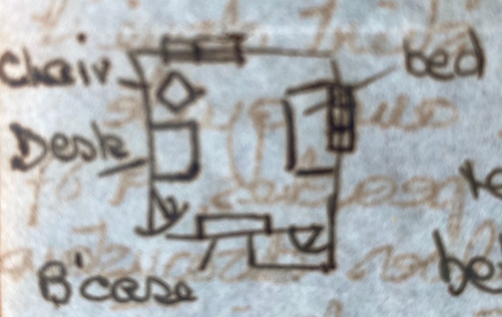 I said that we had slackened off in our entertaining, but golly! – we seem to have had a regular spree of having in & going out lately. Last night Cec brought one of the fellows home from the Lab. for dinner – Boris Stoicheff (? spelling!) – do you remember his mentioning him. He is very jolly & nice & just loved his dinner – such a treat to feed! I gave them broiled chicken livers rolled in bacon; Provençal tomatoes (I can still smell the garlic!) au gratin potatoes; stuffed celery & olives & blueberry pie to follow. We were all as stuffed as the celery, but it was good! I did the chicken livers that way for Cec & I a week or so back and we liked them very much. Cec & Boris went back to work afterwards- Cec has been back a lot this week & is there tonight – trying to get his stuff working as some big bugs are going round tomorrow. On Wed. he didn’t go back but slept solidly except for 20 minutes for dinner, from 6 pm. to 7:30 a.m.! Monday was Labour Day – a holiday – & next day all the schools open again – I always feel such a joy & relief that it has nothing to do with me!! Cec was at home, but it was a dull, rainy day & we didn’t do much. We have the room upstairs still on the way, as Cec hasn’t had time to do anything this week, but he has cleaned & mended all the desk & I polished it & although it is old, it is a nice dark oak & looks good. I cleaned Cec’s old chair & it looks much better & Cec brought up the bricks & put up the bookcase. Now it looks so: