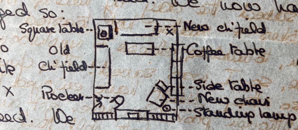 I was going to tell you what our sitting room looks like now, but got distracted – it is wonderful to have so much seating space & since Cec vacuumed the chesterfield & chair thoroughly they look fine. You can tell they are quite new from the underneath of the cushions etc.- the top surface was just dusty & they smelled kind of musty as the basement apt. the fellow had was very damp. Of course they are kind of dark winey-red with a fine grey wavy line through, so don’t really go with the rug, but they are subdued so don’t look too bad. We now have the room arranged so: