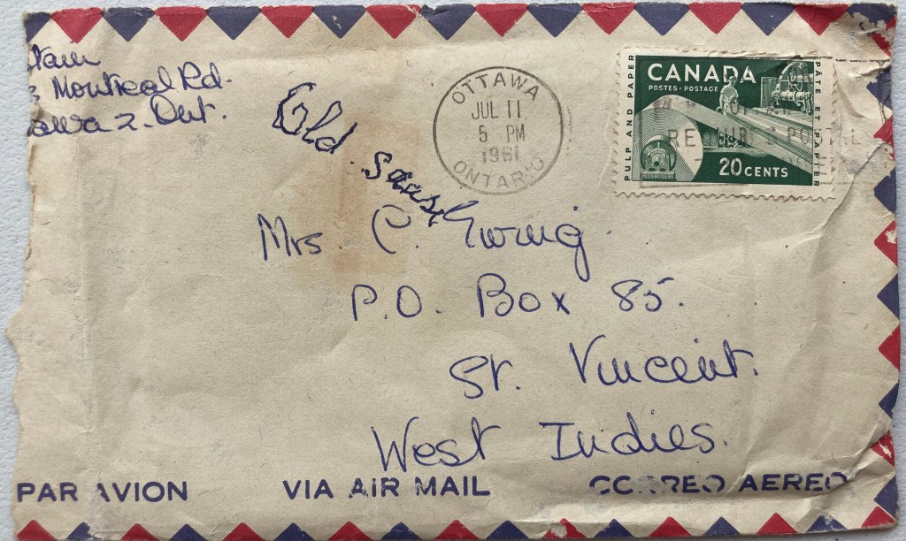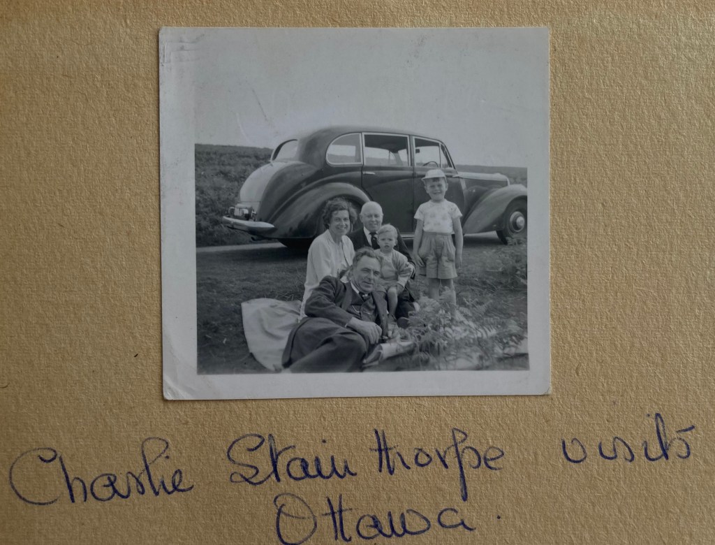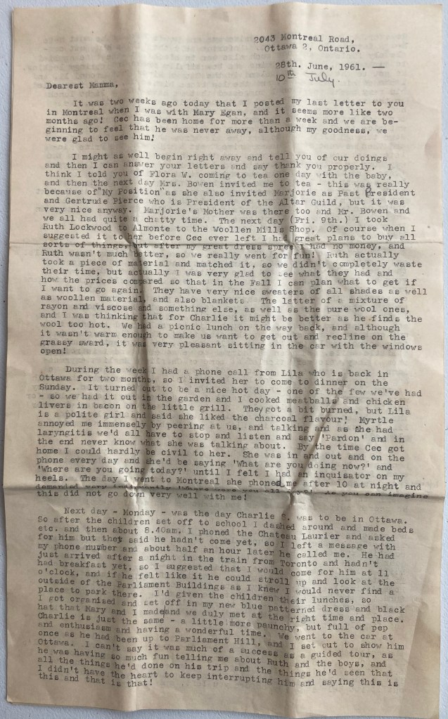 Dearest Mummy, It was two weeks ago today that I posted my last letter to you in Montreal when I was with Mary Egan, and it seems more like two months ago! Cec has been home for more than a week and we are beginning to feel that he was never away, although my goodness, we were glad to see him! I might as well begin right away and tell you of our doings and then I can answer your letters and say thank you properly. I think I told you of Flora W. coming to tea one day with the baby, and then the next day Mrs. Bowen invited me to tea- this was really because of “My Position” and she also invited Marjorie as Past President and Gertrude Pierce who is President of the Altar Guild, but it was very nice anyway. Marjorie’s Mother was there too and Mr. Bowen and we all had quite a chatty time. The next day (Fri. 9th) I took Ruth Lockwood to Almonte to the Woollen Mills Shop. Of course when I suggested it to her before Cec ever left I had great plans to buy all sorts of things, but after my great dress spree I had no money, and Ruth wasn’t much better, so we really went for fun! Ruth actually took a piece of material and matched it, so we didn’t completely waste their time, but actually I was very glad to see what they had and how the prices compared so that in the Fall I can plan what to get if I want to go again. They have very nice sweaters of all shades as well as woolen material, and also blankets. The latter of a mixture of rayon and viscose and something else, as well as the pure wool ones, and I was thinking that for Charlie it might be better as he finds the wool too hot. We had a picnic lunch on the way back, and although it wasn’t warm enough to make us want to get out and recline on the grassy sward, it was very pleasant sitting in the car with the windows open! During the week I had a phone call from Lila who is back in Ottawa for two months, so I invited her to come to dinner on the Sunday. It turned out to be a nice hot day – one of the few we’ve had – so we had it out in the garden and I cooked meatballs and chicken livers in bacon on the little grill. They got a bit burned, but Lila is a polite girl and said she liked the charcoal flavour! Myrtle annoyed me immensely by peering at us, and talking and as she had laryngitis we’d all have to stop and listen and say ‘Pardon’ and in the end never know what she was talking about. By the time Cec got home I could hardly be civil to her. She was in and out and on the phone every day and she’d be saying “What are you doing now?” and “Where are you going today?” until I felt I had an inquisitor on my heels. The day I went to Montreal she phoned me after 10 at night and demanded very indignantly “Where were you all day?” As you can imagine this did not go down very well with me! Next day- Monday- was the day Charlie S.[Stainthorpe] was to be in Ottawa. So after the children set off to school I dashed around and made beds etc. and then about 8:40 a.m. I phoned the Château Laurier and asked for him but they said he hadn’t come yet, so I left a message with my phone number and about half an hour later he called me. He had just arrived after a night in the train from Toronto and hadn’t had breakfast yet, so I suggested that I would come for him at 11 o’clock, and if he felt like it he could stroll up and look at the outside of the Parliament buildings as I knew I would never find a place to park there. I’d given the children their lunches, so I got organized and set off in my new blue patterned dress and black hat that Mary and I made and we duly met at the right time and place. Charlie is just the same – a little more paunchy, but full of pep and enthusiasm and having a wonderful time. We went to the car at once as he had been up to Parliament Hill, and I set out to show him Ottawa. I can’t say it was much of a success as a guided tour, as he was having so much fun telling me about Ruth and the boys, and all the things he done on his trip and the things he’d seen that I didn’t have the heart to keep interrupting him and saying this is this and that is that! However, we went around the Driveways and Dow’s Lake so he must have had a favourable impression. Unfortunately the tulips had just completely finished and not much else was in bloom and the same applied to our garden, but everything was beautifully green and springy looking. We got to the Champlain Island in the Ottawa River just around 12, and I showed him the rapids, and the log booms higher up, which interested him very much, and then I suggested that we have just a light lunch in the restaurant there, and he thought this was a good idea. We had toasted Western sandwiches and coffee, and he’d not had such a sandwich before and he thought it was a beautiful restaurant so it was nice to please him. Afterwards, I took him over the bridge and down through Hull and he saw the view from that side of the river, and then we went down Sussex Drive, past N.R.C. and the Prime Minister’s and Governor General’s etc. and through Rockcliffe Park. On the way home we passed Steinberg’s and Loblaw’s and I told him I shop there, and then I suddenly thought he might like to see one, so back we went and I took him through Steinberg’s much to his amazement and interest! He bought some cherries to have on the train next day and then saw some corn and asked if that was what it was, as their Courier had said they hadn’t lived until they had eaten corn on the cob, so of course I got some, although it was not in season, so it wasn’t very good, but at least he’d have some idea of what it is like. We got home around 2:30 I think, and we sat chatting for a little, and I noticed that he was looking a bit droopy eyed, so I suggested that he should lie down and have a little nap, so I think he was very happy to do so. I was happy too, as I shut myself in the kitchen and managed to get the dinner well on the way. I had a chicken casserole with baco