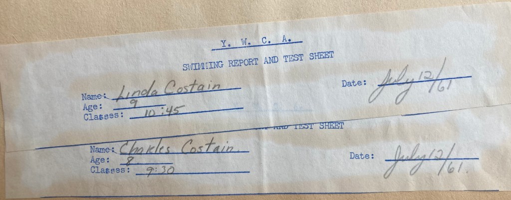 Cec has now started work on the driveway – first of all he is lifting all those big flag stones at the front door and putting fill underneath and levelling them out and now he is going to put new asphalt on the driveway itself. He then has to re-tar the roof – both such horrid messy jobs. I can’t remember if I told you that while Cec was away I finally booked us a cottage for the first two weeks in August. We had looked over the literature previously, and decided on one or two that looked nice, and I wrote and one of the places was booked up and the other had a cottage, so I booked there. It sounds good – on a lakefront, with a sandy beach, indoor plumbing, refrigerator, and electricity of course, inner spring mattresses and boats to hire, so I hope it turns out as good as it sounds. It is due west of here and is north of Toronto in a part of Ontario called the Haliburton Highlands, and it is supposed to be very beautiful country, so I hope we’ll have a good time. We leave here on 29th July and stay there for 2 weeks, then we plan to drive down to Stratford to see the matinee of “The Pirates of Penzance” and then go on to Merle for the weekend before coming home. Last week was the first week of the children’s holidays, and I had booked them both for swimming lessons at the YWCA. Charlie’s lessons were from 10 to 10:30 and Lindy’s from 10:45 to 11:15 so they fit in very well. They were both quite excited about them and then of course on the Sunday poor Charlie’s eczema all broke out again, and he had a temp. once more. I called the Dr. on Mon. and he sent out some more penicillin pills, and I kept putting the ointment on them, and then suddenly he threw up his breakfast. However, he wasn’t sick again and by the evening I could give him a pill and he was feeling fine and hungry! Of course he couldn’t go to his swimming lesson though but, I took him along to watch Lindy’s and the teacher suggested he come and watch his own classes and that is what he did until Friday when he was O.K. and could go swimming himself. His legs cleared up and I came to the conclusion that it must have been a slight tummy flu because on Thursday and Friday I was quite off, and very achy and tired. They are both loving the lessons though and on the very second day Lindy took off and swam across the pool! I am not allowed to watch but she says she can swim on her back and that they are going to learn to dive and can hardly bear to come away from the lesson. The teacher is a young teenager, but the classes are nice and small – not more than 12 and Lindy’s has now dwindled to 4, so they get lots of attention. Of course I spend my whole morning in town spending money and drinking coffee and getting no work done!