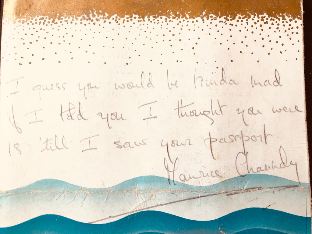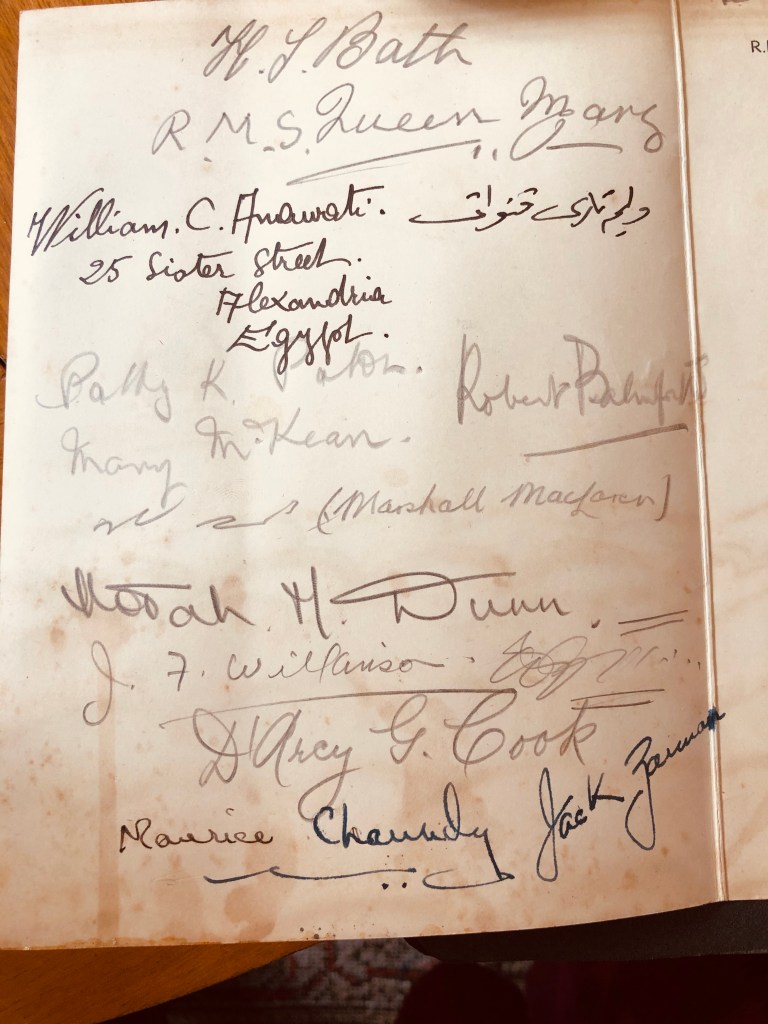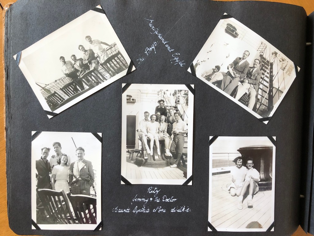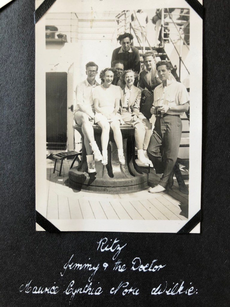 Arrived to find the place crowded Wilkie & the Doc waiting for me & then with Harlan Heath- Maurice’s friend – an ‘Honourable’ incidentally! We all sat round & drank Tom Collins & after the Concert was over danced- greatly teased with my menu & bag & everything. Maurice showed me his Year Book – awfully interesting. Waited & waited for Jimmy to appear but he didn’t for positively hours. Ritz & Beatrice went eventually & the doctor – Wilkie asked me to walk but Maurice would’ve been left, so I didn’t. Nora went down to Wilkie’s cabin & got the remains of a bottle of Scotch, but there wasn’t much & I loathed it anyway. Jimmy finally appeared when only Nora, Bob, Maurice & I were left. The five of us decided to make a night of it, so we just sat & slept & fooled around. I tried to persuade Jimmy to play, but he only had spasms. I slept on Maurice’s shoulder & we played a silly trick with sixpences.