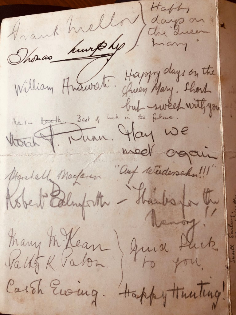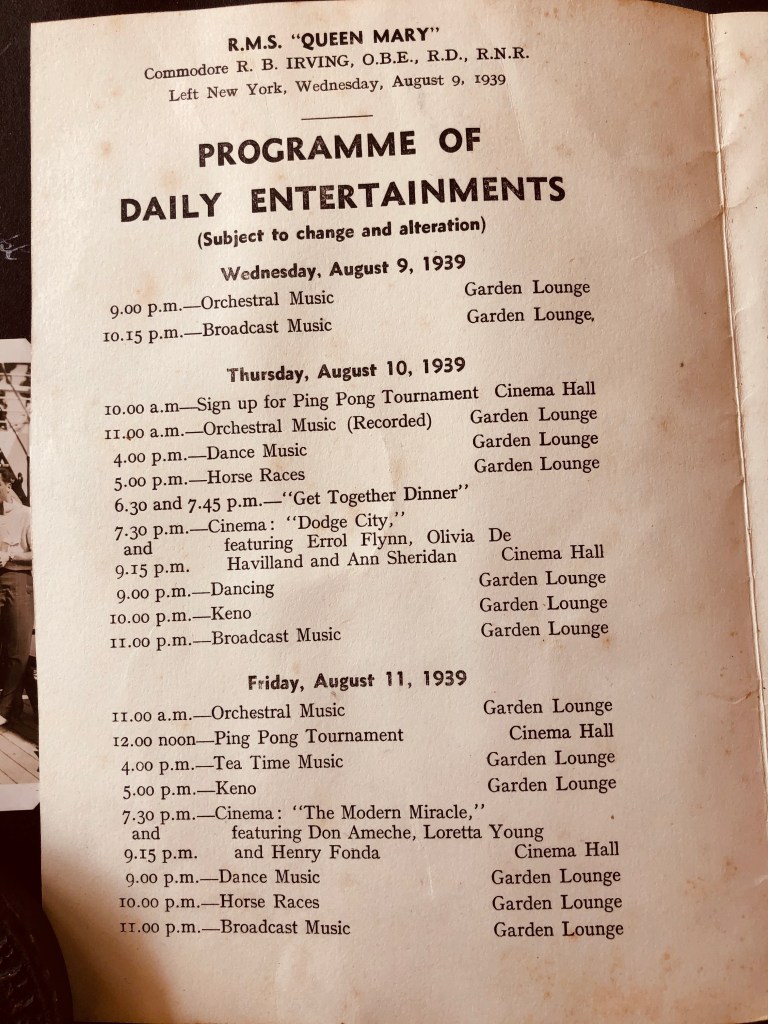 Up and played ping-pong afterwards with Wilkie & Maurice. Mummy thought she would like to see Cabin Class and Tourist, so she asked Egypt to take her – with Nora & me as chaperones! He was very pleased & acted guide most efficiently. On your left the something & on your right the something else! Found Henry & traipsed all over, saw the swimming pool & cabins & all. Up on deck & William took our photos holding the Queen Mary life belt – very funny. Then Nora & Mummy had tea on deck- no more appeared, so Henry & William took me into the covered deck space & we had it together. Henry gazing at me intently and paying me compliments – especially about my eyes. Dear Henry! He must be nice!