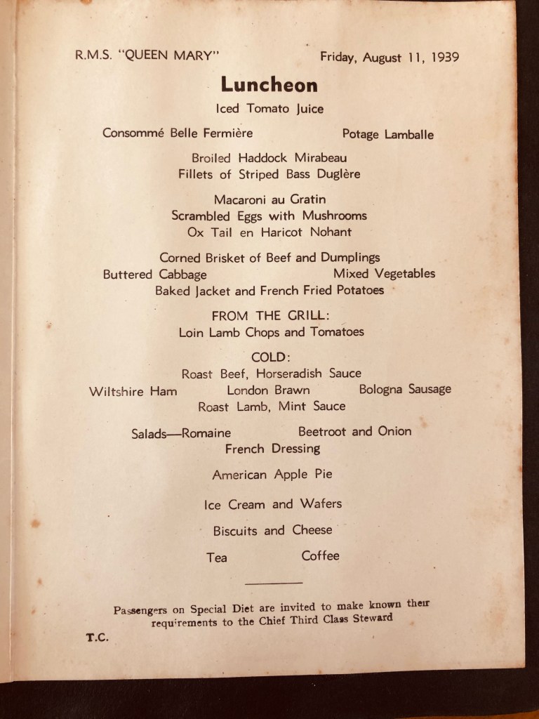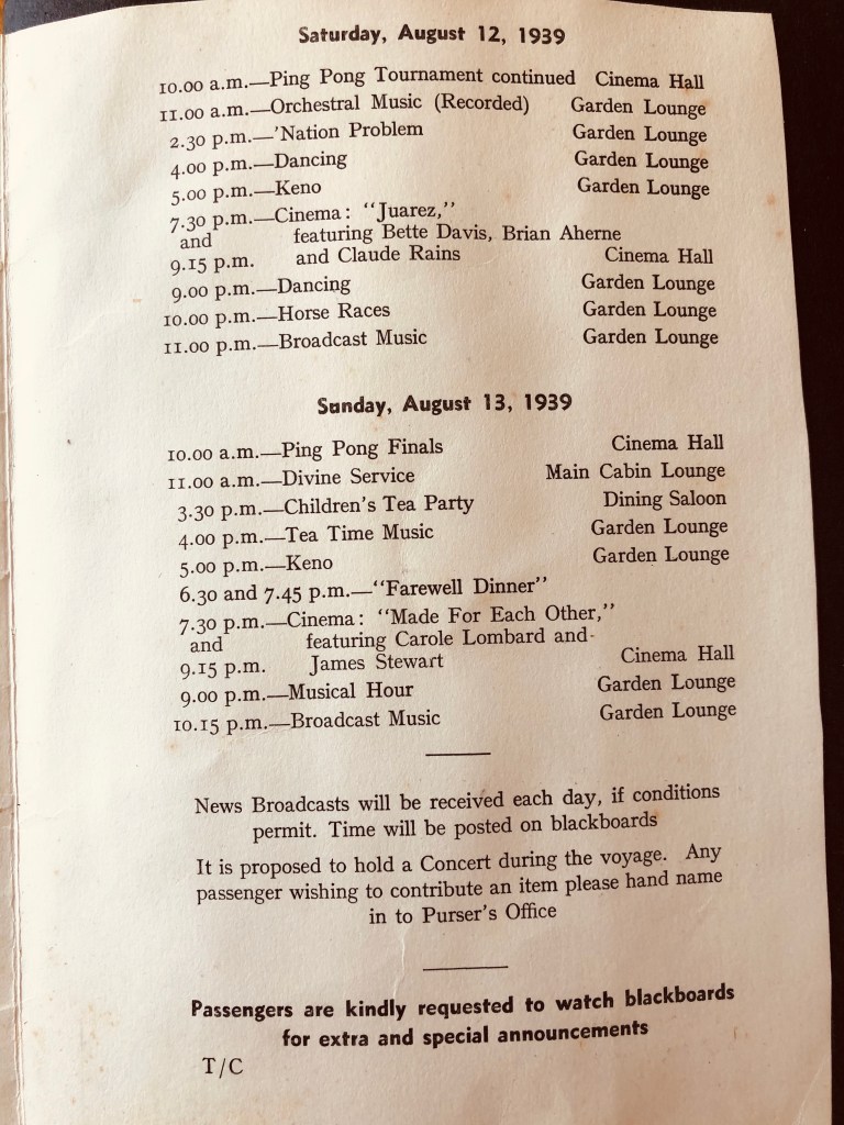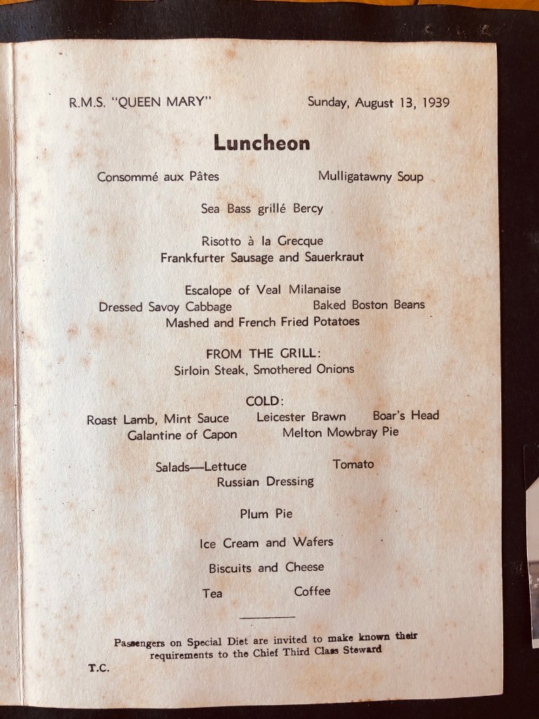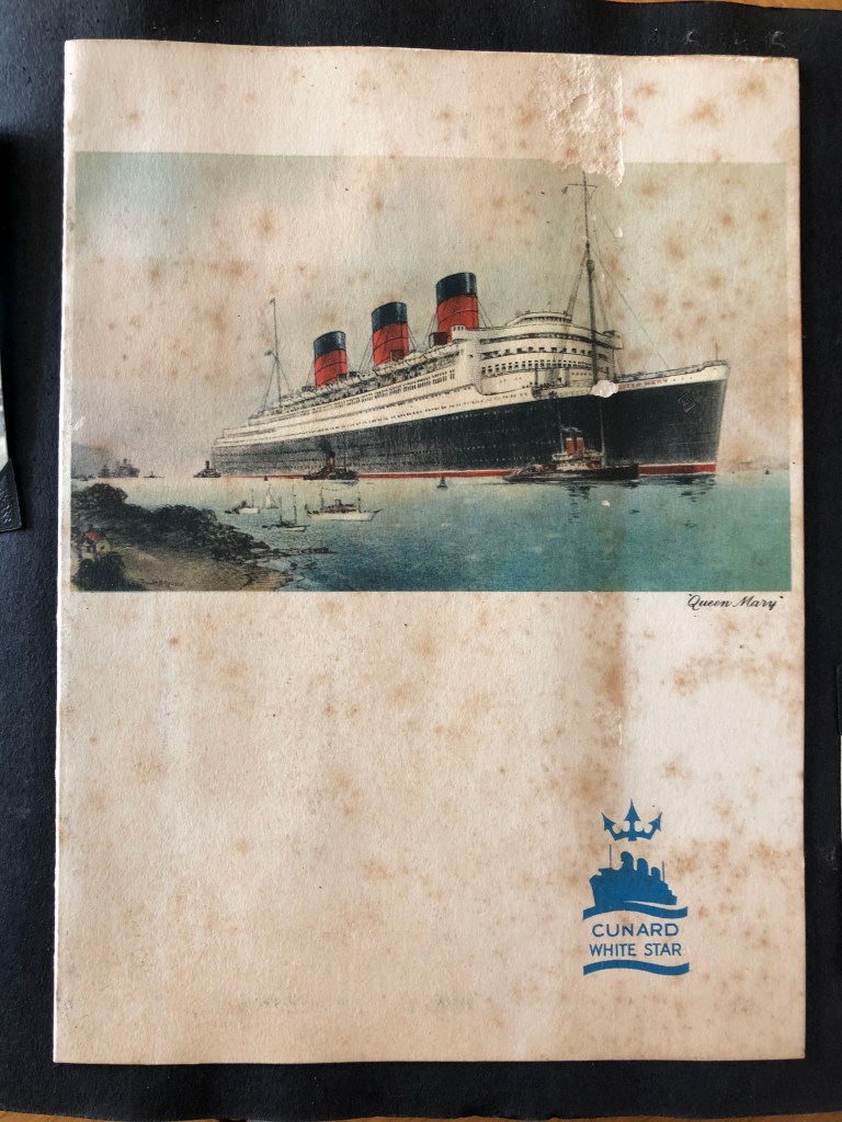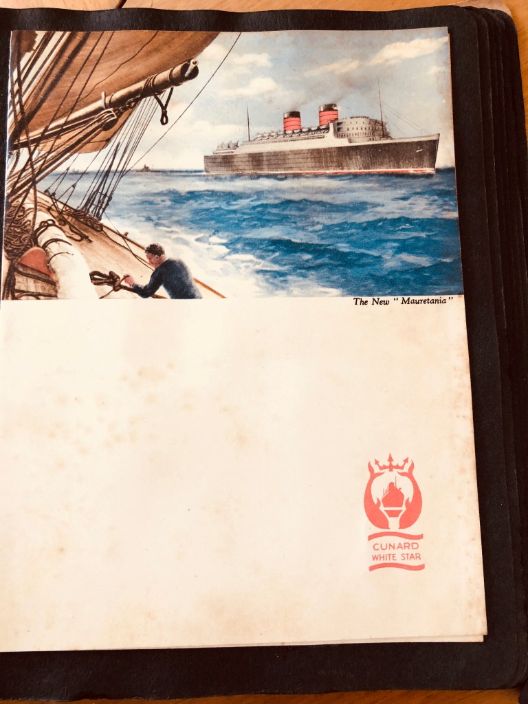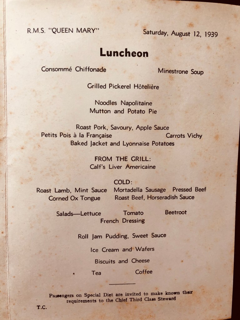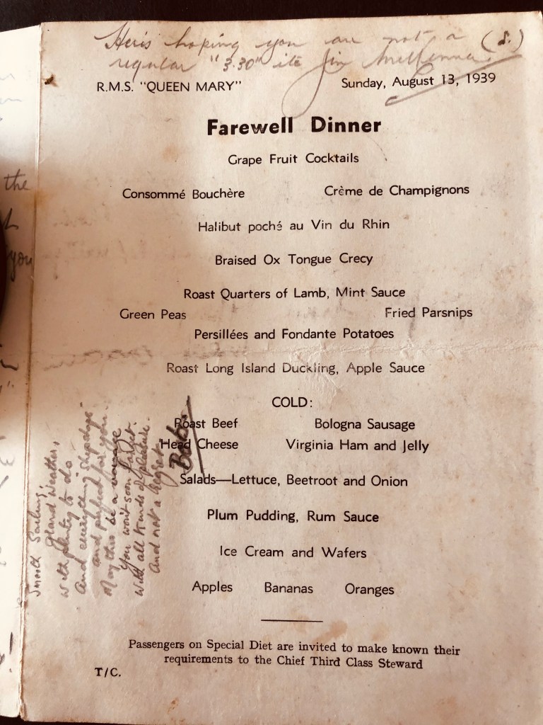 All up early. Finished packing. Margs & Bibi off early. Quite het up in case we were late. Mum & I off with Monie in the car plus luggage. The rest by tube. Hellish hot & a lousy journey through the city. Arrived at last deposited luggage safely & got rid of it. Then through the barriers – saw Eileen & her mother too- & onto the ship. Made our way to the cabin & found the rest there. All up to the Smokeroom & sat. A terrific crowd- couldn’t see the boat at all – eventually time to go- said goodbye to everyone- Uncle Artie- Aunt Phine- Bibi- Aunt Ettie- Aunt Moo- Aunt Trix- Margs- Monie- Peg & Bill. Boxes of candy from Uncle Artie & Bill. Up on deck & tried to see them – very crowded, so got some men to heave me onto deck chairs & saw beautifully but very tough on the feet. Mum up too. Away, at last – waved & waved until we could see them no more, then downstairs as it was so hot.