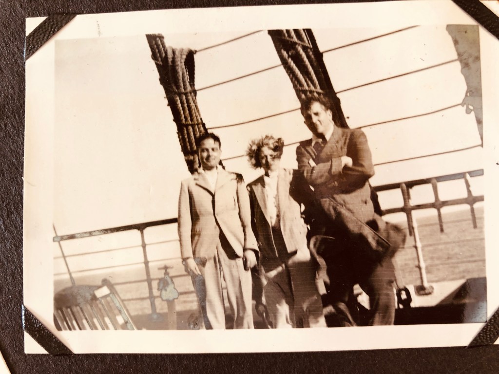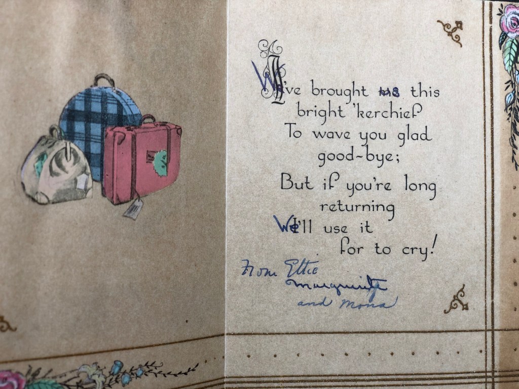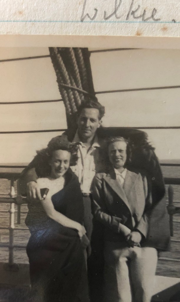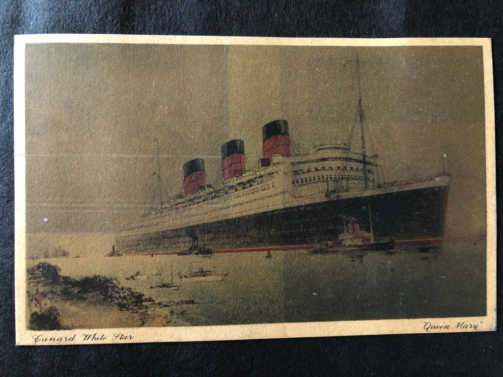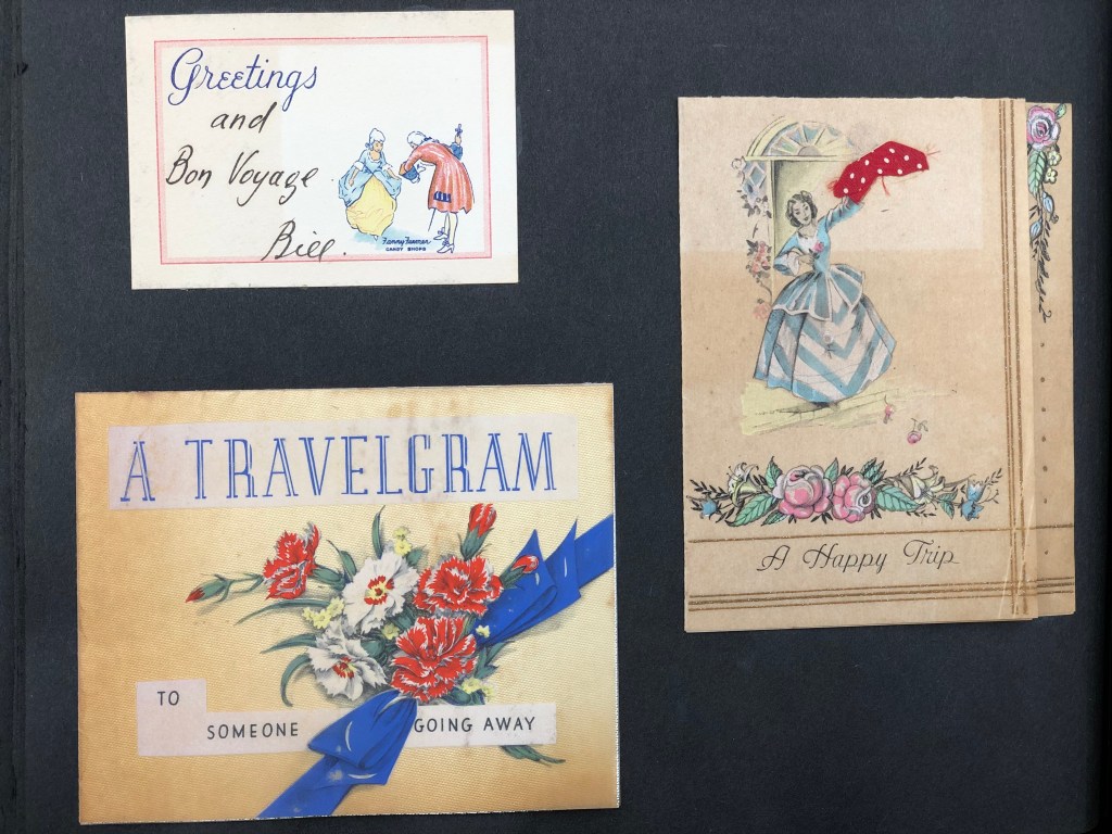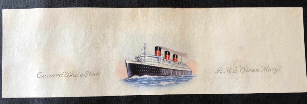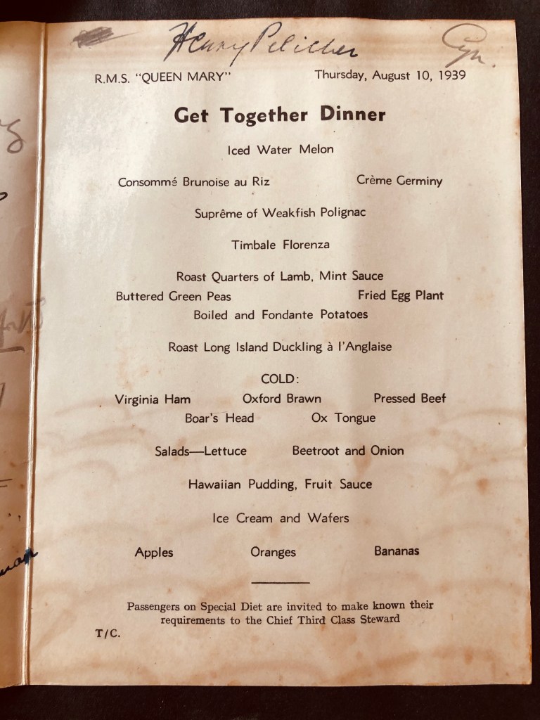 All up early. Finished packing. Margs & Bibi off early. Quite het up in case we were late. Mum & I off with Monie in the car plus luggage. The rest by tube. Hellish hot & a lousy journey through the city. Arrived at last deposited luggage safely & got rid of it. Then through the barriers – saw Eileen & her mother too- & onto the ship. Made our way to the cabin & found the rest there. All up to the Smokeroom & sat. A terrific crowd- couldn’t see the boat at all – eventually time to go- said goodbye to everyone- Uncle Artie- Aunt Phine- Bibi- Aunt Ettie- Aunt Moo- Aunt Trix- Margs- Monie- Peg & Bill. Boxes of candy from Uncle Artie & Bill. Up on deck & tried to see them – very crowded, so got some men to heave me onto deck chairs & saw beautifully but very tough on the feet. Mum up too. Away, at last – waved & waved until we could see them no more, then downstairs as it was so hot.