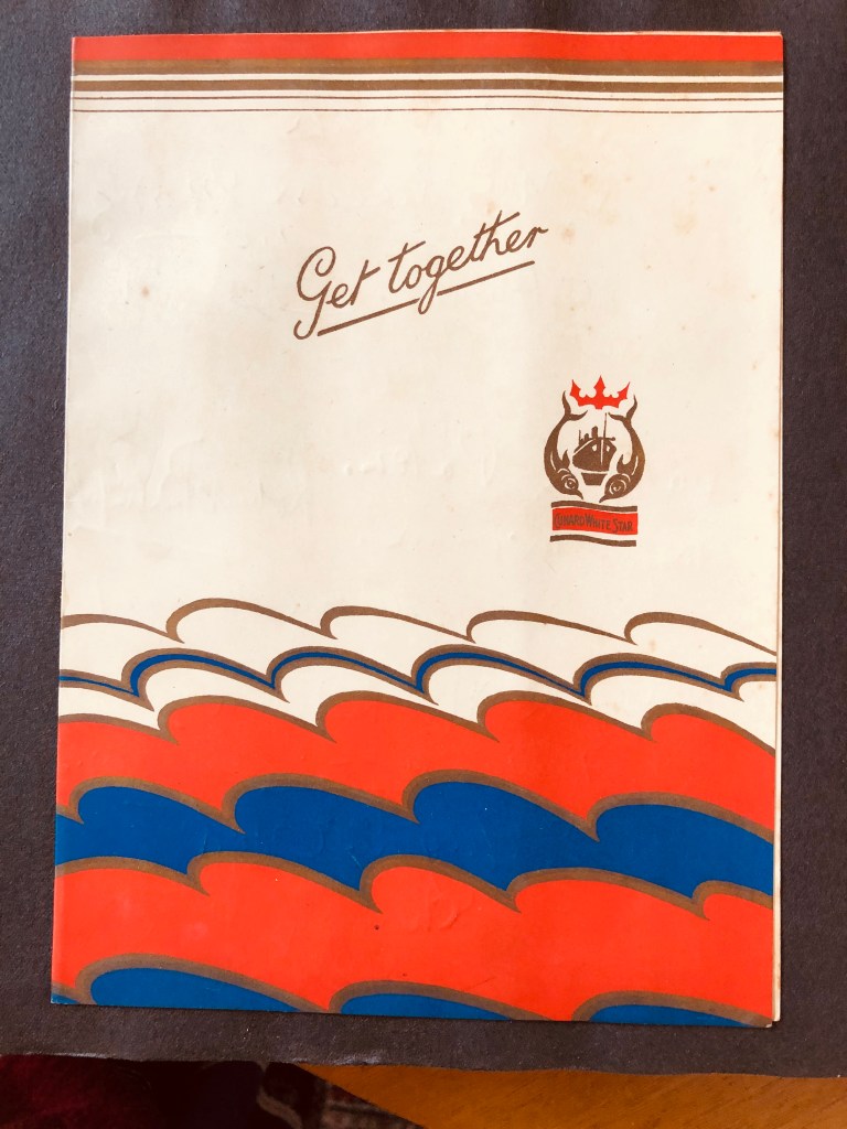 Down & got dressed for dinner – green muslin with black bows. In feeling very cheery – a Get Together Dinner – I was longing to get together! George, our steward – a funny little Cockney – very full of beans – insisted on signing menus for us all so we all signed.