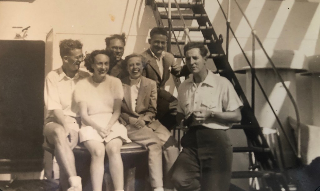 Had lunch to which Wilkie manage to totter. Afterwards we all grabbed cameras and rushed up on deck as it was nice & sunny, but most frightfully windy. Took some funny groups – Wilkie, Maurice, the Doctor, Jimmy, Ritz, Bob, Nora & me – all positions. Then dashed downstairs & saw the immigration authorities.