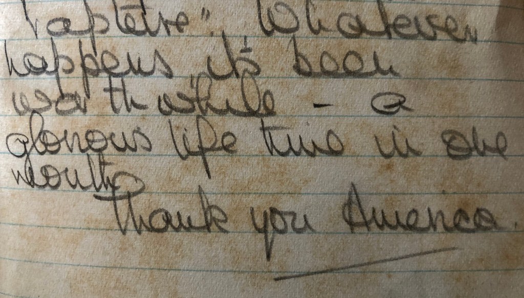 During the Finale the Doctor suddenly leapt up, shook my hand & said good-bye before it dawned on me that he was going. He had to catch the 11:40 to Glasgow.