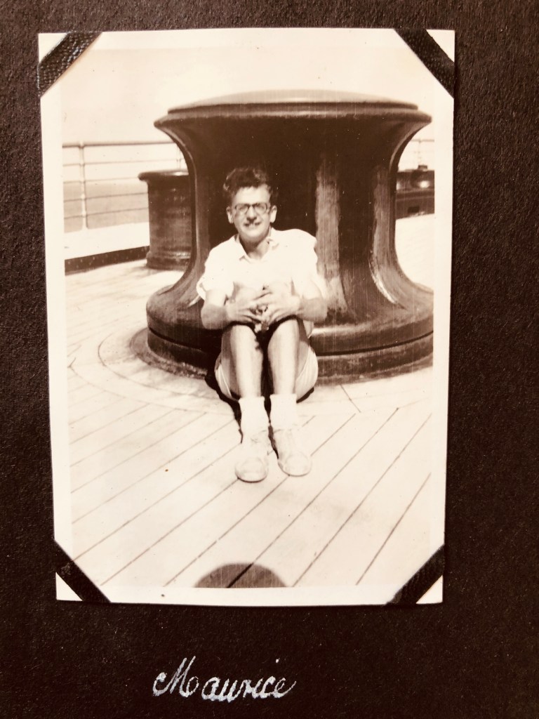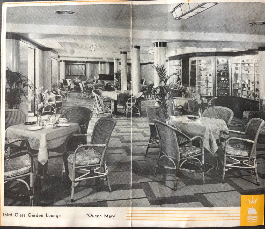 Upstairs to the Garden Lounge for dancing. Sat a table with two American boys- only discovered one wasn’t American. His name is Maurice Chaundy & he was an exchange student from Rugby to the American school Choate for a year. He is rather nice, but looks & speaks quite typically American. Talked for a while and my friend Mr. Wilkinson came and smiled at us. Then Egypt once more appeared with Henry & insisted on us going Tourist. I didn’t want to go at all, so Mummy said we must only go for 1/2 hour & off we trailed. Got there eventually & found instead of dancing- community singing! Very bored, so went back in prompt 1/2 hours time. To find dancing finished & revolting game Keno going on. Deserted Egypt & Henry & sat & talked to Maurice & Mr. Wilkinson & the other American boy, Jack. After a while Keno stopped & recorded dance music came through. Danced à la American with Maurice, Jack & Wilkie- most successful. Maurice & I even danced cheek to cheek but it made me laugh rather! Nora didn’t manage so well – she doesn’t look much of a dancer though.