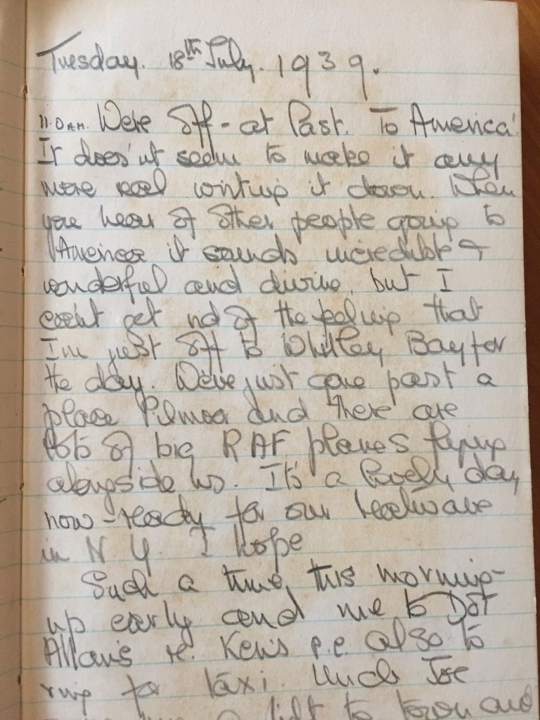 Peggy & I then decided to go into 1st lunch so as not to miss anything, so we asked our steward & he fixed it. Jacob came & had coffee with us then we all went & finished packing. Jacob & I up on fore deck then and saw heaps of boats. Most terribly still and hot with a heat haze all over. Peggy joined us & then at last land appeared – little bit a time. More & more land & then in the distance the Statue of Liberty – it came closer & closer & then suddenly in the mist we saw the skyscrapers- great shadows which got clearer & clearer. Nelson came & showed us a few of the things then we began to get into the dock. Crowds of people waiting & every minute it got hotter- talk about heat waves! As the ship came along side the dock, all the hundreds of people waiting waved & shouted, but we couldn’t see anyone we knew. Peggy & Jacob & I stood on piles of rope & watched for ages until at last I saw someone that looked like Marguerite then Peggy recognized Auntie Muriel & we all got wildly excited & waved & yelled.