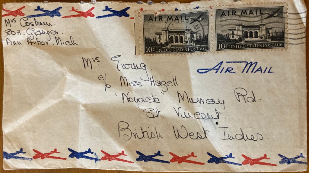 Cyn’s letters seem to reach Trinidad quite quickly- this one was written on the 23rd, posted on the 24th, and stamped in various parts of Trinidad on the 27th and 28th, having been redirected by Auntie Trix to her son’s house where Carol must have moved to visit, but nothing from her is getting to Cyn and Cec in Ann Arbor! It is interesting, though, to hear about the visit to Toledo they had been reluctantly forced into, and to get Cyn’s take on Til’s son Bill’s second wife whom she had heard about, but not met, at the end of her year teaching there.