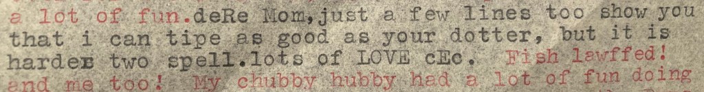 [Switch to typing in black ink.] deRe Mom, just a few lines too show you that I can tipe as good as your dotter, but it is harder two spell. lots of LOVE cEc. [Back to red ink, with reference to O. Douglas, ‘The Setons’] Fish lawffed! And me too! My chubby hubby had a lot of fun doing that! On Sunday we celebrated by going to the Drug Store and having a chocolate milk shake, which is practically my favourite amusement! No wonder I am still spreading. I tried on my summer dresses this week and I am now a sad woman – I have proof of what I suspected! My pink and black is too tight to do more than bust over my bust, and my tussore is tight over the ‘ips. The latter I am going to try and let out but the other one is beyond hope. I asked Mrs. S. whether she thought Anne could wear my things and so she is going to try them and see, because the pale turquoise one with the buttons is very short now and also my blue corduroy suit is short and tight, so if she can wear my things she might as well have them. Really, I have had all those things three and four years now so it isn’t too bad. Cec is mad because the trousers he got in France last year and also the ones he got the year before are not only tight around the waist but have shrunk at the cleaners so we are making up a parcel and sending them all to his young brother!