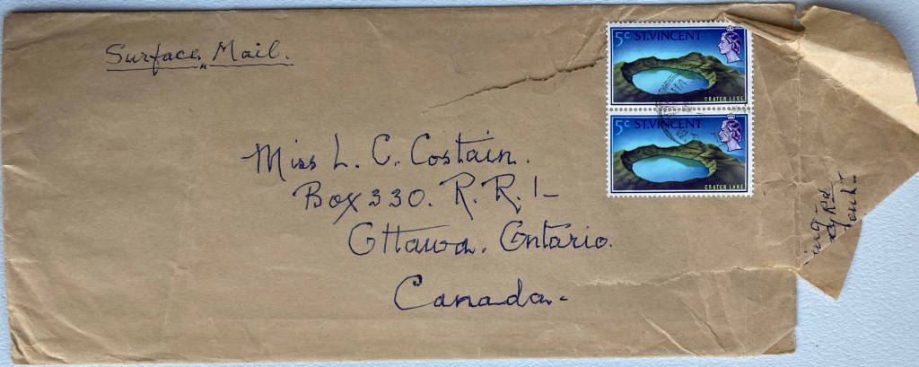 This letter from Carol Ewing (Grannie) to Linda, now 16 years old in Grade 12, seems to have accompanied the return of the Travel Diary which had taken her a few months after the summer trip to be completed and sent out to Grannie, with a plea for its return as a memento. In the letter, Carol mentions the younger generation of Hazells in St Vincent- older than Linda and at a different stage of life, but also leading what seemed to her (Linda) an exotic existence with parties, dancing and cars. [Recap of relationships in St. Vincent: Alex and Peggy Hughes, Cyn’s cousin and Carol’s niece, had the party for their daughter Margaret. Patrick is the adult son, Perry another, quite a bit younger. Milly and Ford are the visiting New York cousins of Peggy and Cyn’s generation, but older. Uncle Fred is Carol’s brother, Peggy’s father, and has been ill. Auntie Moo (Muriel) is the oldest Hazell sister, and Carol lives with her.]