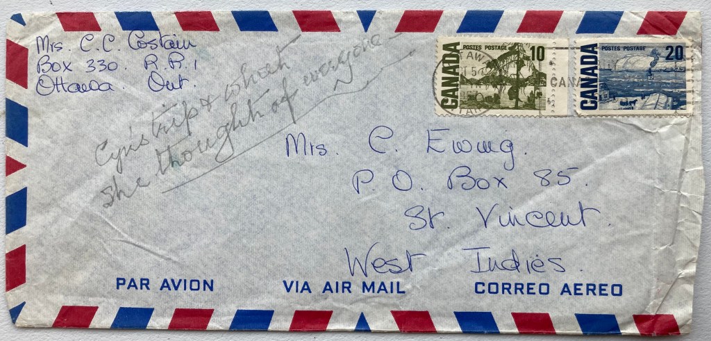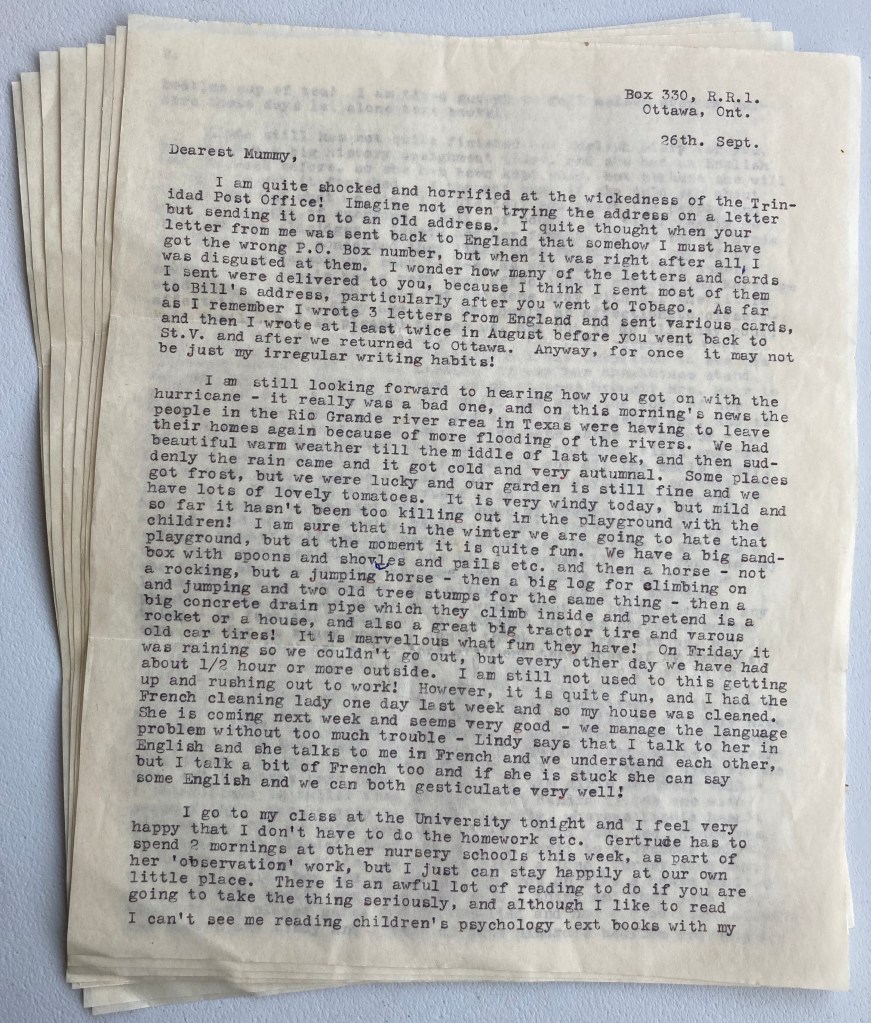 I am quite shocked and horrified at the wickedness of the Trinidad Post Office! Imagine not even trying the address on a letter but sending it on to an old address. I quite thought when your letter from me was sent back to England that somehow I must have got the wrong P.O. Box number, but when it was right after all, I was disgusted at them. I wonder how many of the letters and cards I sent were delivered to you, because I think I sent most of them to Bill’s address, particularly after you went to Tobago. As far as I remember I wrote 3 letters from England and sent various cards, and then I wrote at least twice in August before you went back to St. V. and after we returned to Ottawa. Anyway, for once it may not be just my irregular writing habits!
