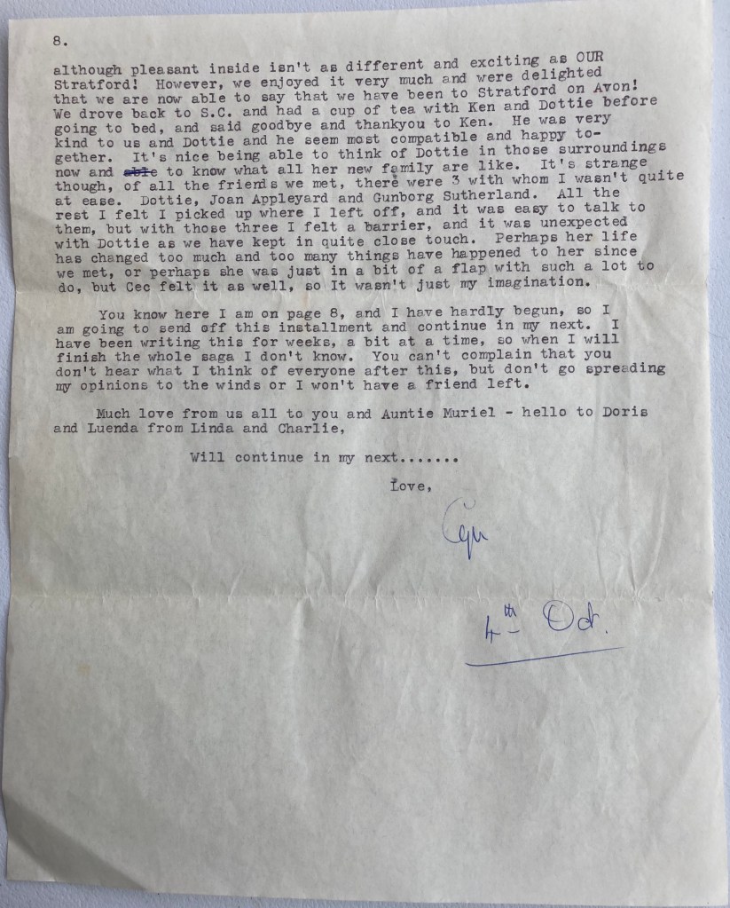 On the Monday, everyone was back at work, and Tim was at school and after breakfast we set out for Stratford. It was a lovely drive through Kenilworth to Warwick, where we stopped and went over the castle. It was really beautiful, and Linda and I particularly enjoyed all the gorgeous paintings and fascinating things inside, and all the beautiful rooms arranged with lovely furniture, but it didn’t appeal to Cec and Charlie as much as the big ruined Welsh castles with broken down ramparts and little spiral staircases in the walls. Linda will tell you more about Warwick, I’m sure, so I won’t elaborate. We went to a very nice Hotel there and had a lovely lunch – it was a roasting hot day, so we were quite tired after our tour of the castle and gardens, so were glad of the lunch and rest. We got to Stratford in the early afternoon and found it crowded of course. Jessie Aldridge had managed to get us seats for the theatre through the Club where she works, and so we had to go and claim them. Then we toured around and saw the various sights – Shakespeare’s birthplace, his daughter’s house etc. etc. It was so hot – about 83°, that day, so we took full advantage of all the pretty gardens and parks and kept sitting down in the shade of trees wherever we went! We had tea in one hotel, and then we felt we had to have something before the theatre at 8:30, but having had a big lunch, we weren’t all that hungry, and you know in England you either go to a hotel for a Full Course Dinner or to a café for sort of fried egg and chips, and the latter were hot and crowded! Finally we found one kind hotel which put us in a sort of bar-lounge and served me with cider and Cec with beer and the children with cokes and served us a huge plate of sandwiches – tomato, chicken and beef and they tasted wonderful! We were in good time at the theatre and enjoyed the play, but “All’s Well that Ends Well” is not one of my favourites, and although it was good, it wasn’t outstanding I didn’t think. None of the actors were well known and of course, the theatre is so hideous outside, and although pleasant inside isn’t as different and exciting as OUR Stratford! However, we enjoyed it very much and were delighted that we are now able to say that we have been to Stratford on Avon! We drove back to S.C. and had a cup of tea with Ken and Dottie before going to bed, and said goodbye and thank you to Ken. He was very kind to us and Dottie and they seem most compatible and happy together. It’s nice being able to think of Dottie in those surroundings now and to know what all her new family are like. It’s strange though, of all the friends we met, there were 3 with whom I wasn’t quite at ease. Dottie, Joan Appleyard and Gunborg Sutherland. All the rest I felt I picked up where I left off, and it was easy to talk to them, but with those three I felt a barrier, and it was unexpected with Dottie as we have kept in quite close touch. Perhaps her life has changed too much and too many things have happened to her since we met, or perhaps she was just in a bit of a flap with such a lot to do, but Cec felt it as well, so It wasn’t just my imagination. You know here I am on page 8, and I have hardly begun, so I am going to send off this installment and continue in my next. I will have been writing this for weeks, a bit at a time, so when I will finish the whole saga I don’t know. You can’t complain that you didn’t hear what I think of everyone after this, but don’t go spreading my opinions to the winds or I won’t have a friend left. Much love from us all to you and Auntie Muriel – hello to Doris and Luenda from Linda and Charlie. Will continue in my next …… Love,