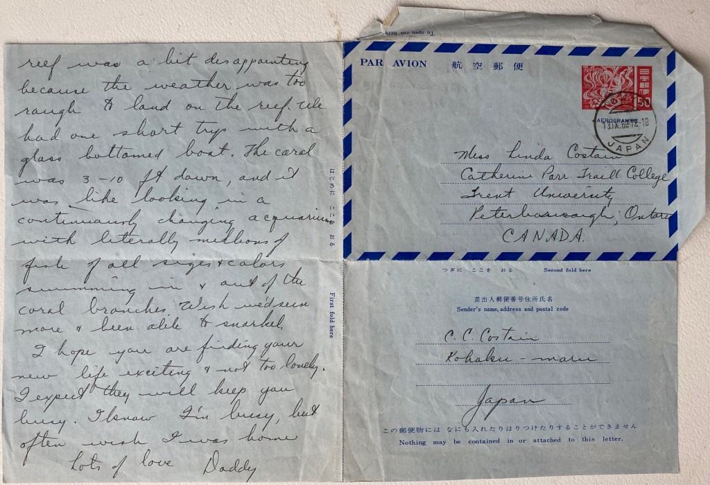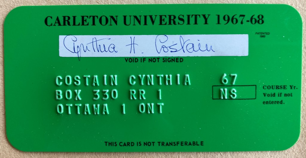 Now I have to go back a bit chronologically, and interrupt the flow of Cyn’s letters to her mother, because I discovered that, like my grandmother Carol, I am a packrat. I may not have kept ALL of the letters Cyn wrote me, but I discovered, while looking for pictures of my university buildings, a stash of letters from that first month of Trent, when I had begged for lots of letters from home. Both Cec, while travelling, and Cyn had responded and so I have nine loving communications sent to 18-year-old Linda to add before Carol gets an overview of the Costains’ life in October ’69.