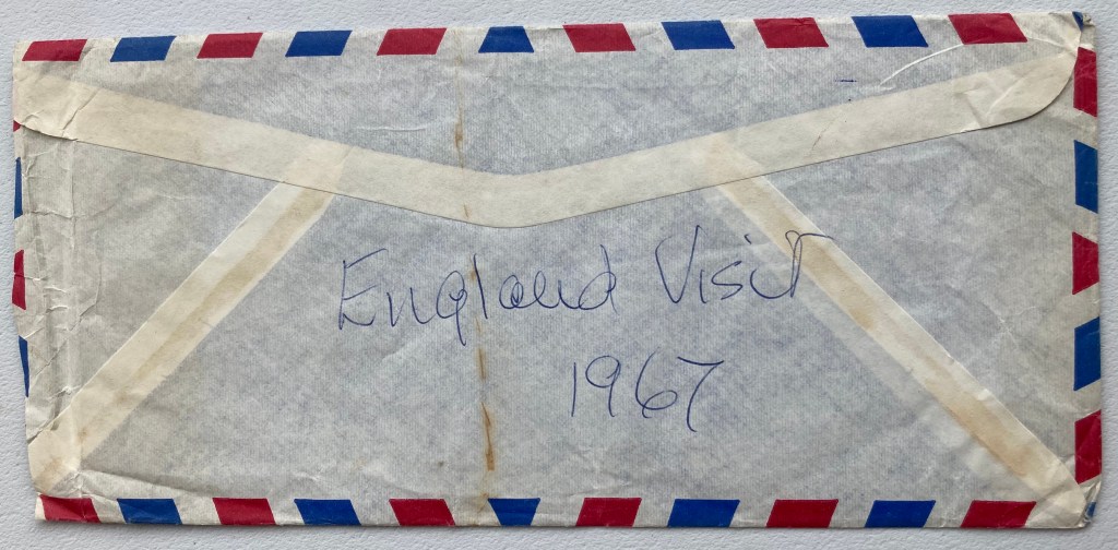 I have mentioned before when I started this project, that both my grandmother (who saved these letters), and my mother (who got them back when my grandmother brought them with her when she came to live with my parents), read, organized and enjoyed these letters years after they were written as they read them again in their old age- and how I am following in their footsteps! On the envelope of this long typed effusion Carol had written an identifier in pencil: ‘Cyn’s trip and what she thought of everyone’ and Cyn later wrote her own on the back: ‘England Visit 1967’. It must have been entertaining to write about her friends after meeting them for the first time in 18 years, and fun for Carol to read about them, and for each to re-read years later. However, at the end of the letter, Cyn asked her mother not to tell anyone about her opinions, or she wouldn’t have a friend left. I am now literally “spreading…[her] opinions to the winds” and hope that they will not offend anyone reading them today! She wrote this spread over a week while working at the newly opened Nursery School, and I am sad that the sequel she promises at the end does not exist- no more letters until April 1968 were preserved.