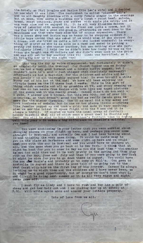 That was the day my voice disappeared, but fortunately it didn’t go completely until the evening! Our Church Supper was on Friday and we had a very good turnout and a lovely buffet supper, but I couldn’t talk to a soul – just whisper when absolutely necessary! Afterwards we had a Magician for the children and adults and he was lovely – we all thoroughly enjoyed him! He even brought a white bunny out of a hat at the end! We have all been enjoying the Olympic games on the TV these last 2 weeks. This is the sort of thing which cancels out all my grumbles at TV, and every evening we had one or two hours from Mexico with both live and taped pictures of the games and it was really grand. Canada didn’t do too well – 1 gold, 3 silver and 1 bronze, but this was 20th out of over 100 countries, so that doesn’t sound too bad as really Canada goes in more for the Winter Olympics. The US as usual did a big sweep and took hundreds of metals, but in one or two places little countries like Jamaica popped up and took a gold, and made it very exciting. Also we saw the latest US space flight with the 3 men and it is always a thrill. Of course we have the usual array of football hockey baseball etc. all of which mean a great deal to Charlie and Cec! You will be glad to hear that Ottawa’s football team is doing well this year – it makes a big difference in Charlie’s spirits, you know! You were mentioning in your letter that you were worried about changing planes on your flight up here, and perhaps you would come straight to Montreal, and actually Cec and I have been talking about it and thinking the very same thing. It would be quite easy to get on the plane at Barbados and come right up here and we would meet you with the car in Montreal and you would have no changes at all, and the same when you go back or to New York. I think that it might be best for you to come in May as you did last time – the weather is not too cold then and it is very pretty in the spring and then stay with us for May, June and July and then if you were going to New York it might be nice for you to go down there in August. You would have the sea at Monie’s and probably go to camp at Mill’s. Cec goes to Australia in August and there is some talk of us going out to the West Coast with him on the first leg of his journey. Carman is always inviting us to visit them and the children and I have never been, so it might be a good opportunity, but of course we don’t know what L. and C. will be doing next summer so it is all very vague and might never come off.