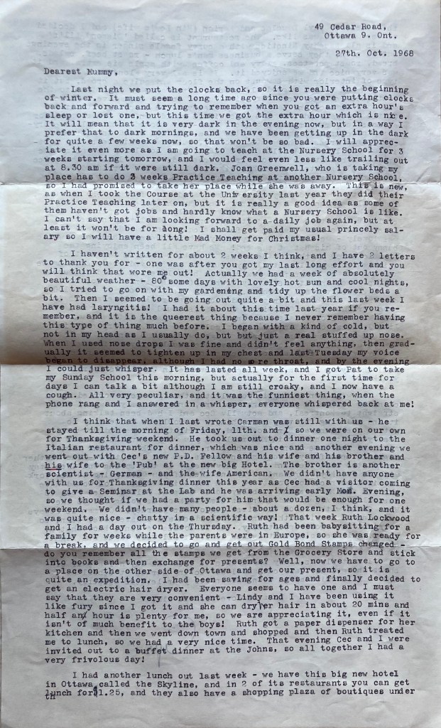 Dearest Mummy, Last night we put the clocks back, so it is really the beginning of winter. It must seem a long time ago since you were putting clocks back and forward and trying to remember when you get an extra hour’s sleep or lost one, but this time we got the extra hour which is nice. It will mean that it is very dark in the evening now, but in a way I prefer that to dark mornings, and we have been getting up in the dark for quite a few weeks now, so that won’t be so bad. I will appreciate it even more as I am going to teach at the Nursery School for 3 weeks starting tomorrow, and I would feel even less like trailing out at 8:30am if it were still dark. Joan Greenwell, who is taking my place has to do 3 weeks Practice Teaching at another Nursery sSchool, so I had promised to take her place while she was away. This is new, as when I took the Course at the University last year they did their Practice Teaching later on, but it is really a good idea as some of them haven’t got jobs and barely know what a Nursery School is like. I can’t say that I am looking forward to a daily job again, but at least it won’t be for long! I shall get paid my usual princely salary so I will have a little Mad Money for Christmas! I haven’t written for about 2 weeks I think, and I have letters to thank you for – one was after you got my last long affair and you will think that wore me out! Actually we had a week of absolutely beautiful weather – 60° some days with lovely hot sun and cool nights, so I tried to go on with my gardening and tidy up the flower beds a bit. Then I seemed to be going out quite a bit and this last week I have had laryngitis! I had it about this time last year if you remember, and it is the queerest thing because I never remember having this type of thing much before. I began with a kind of a cold, but not in my head as I usually do, but just a real stuffed up nose. When I used nose drops I was fine and didn’t feel anything, then gradually it seemed to tighten up in my chest and last Tuesday my voice began to disappear, although I had no sore throat, and by the evening I could just whisper. It has lasted all week, and I got Pat to take my Sunday School this morning, but actually for the first time for days I can talk a bit although I am still croaky, and I now have a cough. All very peculiar, and it was the funniest thing, when the phone rang and I answered in a whisper, everyone whispered back at me! I think that when I last wrote Carman was still with us – he stayed till the morning of Friday, 11th and so we were on our own for Thanksgiving weekend. He took us out to dinner one night to the Italian restaurant for dinner, which was nice and another evening we went out with Cec’s new P.D. fellow and his wife and his brother and his wife to the ‘Pub’ at the new big Hotel. The brother is another scientist – German – and the wife American. We didn’t have anyone with us for Thanksgiving dinner this year as Cec had a visitor coming to give a Seminar at the Lab and he was arriving early Mon. evening, so we thought if we had a party for him that would be enough for one weekend. We didn’t have many people – about a dozen, I think, and it was quite nice – chatty in a scientific way! That week Ruth Lockwood and I had a day out on the Thursday. Ruth had been babysitting for a family for weeks while the parents were in Europe, so she was ready for a break, and we decided to go and get our Gold Bond Stamps changed – do you remember all the stamps we get from the Grocery Store and stick into books and then exchange for presents? Well, now we have to go to a place on the other side of Ottawa and get our present, so it is quite an expedition. I had been saving for ages and finally decided to get an electric hairdryer. Everyone seems to have one and I must say that they are very convenient – Lindy and I have been using it like fury since I got it and she can dry her hair in about 20 minutes and half an hour is plenty for me, so we are appreciating it, even if it isn’t of much benefit to the boys! Ruth got a paper dispenser for her kitchen and then we went down town and shopped and then Ruth treated me to lunch, so we had a very nice time. That evening Cec and I were invited out to a buffet dinner at the Johns, so altogether I had a very frivolous day! I had another lunch out last week – we have this big new Hotel in Ottawa called the Skyline, and in two of its restaurants you can get lunch for $1.25, and they also have a shopping plaza of boutiques under the hotel, so Phyl Douglas and Marion (Hin Lew’s wife) and I decided to see what it was like. The restaurant is called “Diamond Lil’s” and it is all Naughty Nineties with a curvy female singer in the evening but at noon, they serve a businessman’s lunch – roast beef, salads, bread, roast potatoes, gravy and coffee with apple pie extra, and it was very nice and we enjoyed it. It is a very Klondike Saloon type of interior with sawdust on the floor and quite a crowd, but it was fun and we had a good old gossip. Afterwards we went down to the boutiques and they were very nice but of course expensive. There was a dress shop and Marion was so happy to be shopping without 3 little boys round that she asked if we would mind if she shopped for a dress, and she tried on quite a lot – she looked wonderful in everything of course as she is slim as a wand and ended in getting a pretty red dress – she wanted another, but saw nothing else that she particularly liked. I told Cec he didn’t know how lucky he was as the dress she bought was 45 dollars and she didn’t even look at the price and was all set to buy another like it! Linda was horrified, so I am bringing her up in the right way!