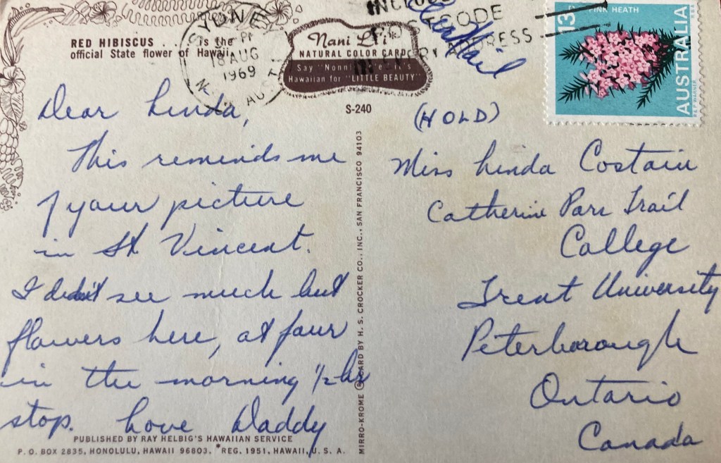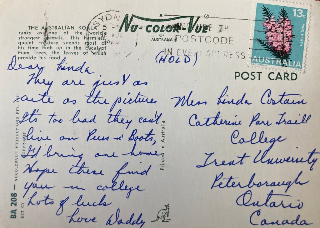 Cec mailed these in August from Hawaii on the 18th, and then from Australia and marked them HOLD so they waited for Linda in her mail slot at Traill for her to arrive on September 11th.