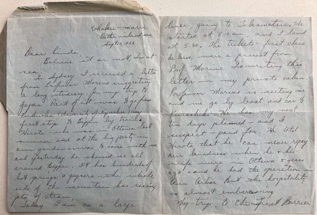 Today I am on a large liner, going to Takamatsu. We started at 8:10 am, and I land at 5:30. The tickets – first class deluxe, were a present from Professor Morino. I am writing this letter in my private cabin. Professor Morino is meeting me and we go by boat and car to Kurashiki. He has my next ten days planned – and I suspect – paid for. He told Hirota that he can never repay our kindness when he & his wife were in Ottawa 5 years ago – and he had the operation in Ann Arbor. But the hospitality is almost embarrassing.