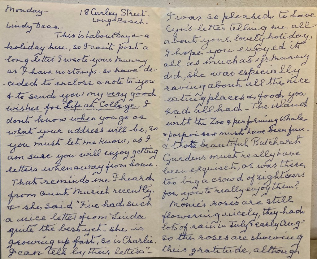 This is Labour Day & a holiday here, so I can’t post a long letter I wrote to your Mummy as I have no stamps – so have decided to enclose a note to you & to send you my verygoodwishes for Life at College. I don’t know when you go or what your address will be, so you must let me know, as I am sure you will enjoy getting letters when away from home.