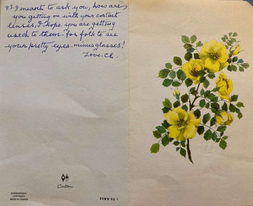 P.S. I meant to ask you, how are you getting on with your contact lenses, I hope you are getting used to them- for folk to see your pretty eyes minus glasses! Love C.E.