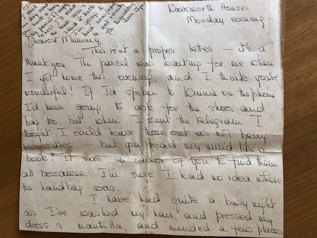 This isn’t a proper letter – it’s a thank you. The parcel was waiting for me when I got home this evening, and I think you’re wonderful! If I’d spoken to Winnie on the phone I’d been going to ask for the shoes and bag too, but when I sent a telegram I thought I could leave those out as not being necessities- but you read my mind like a book! It was so clever of you to find them all because I’m sure I had no idea where the handbag was.