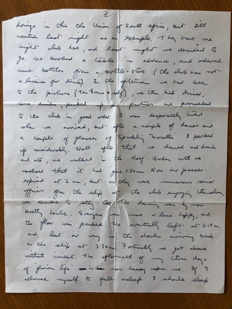 We have had our shore leave. Believe me it came up to expectation. I have had about 12 hours sleep in three nights instead of the usual 24. I’m not going into a recital of all our doings in this the Union of South Africa, but I’ll mention last night as an example. They have one night club here, and last night we decided to go. We booked a table in advance, and ordered some bottles from a bottle-store (the club has not a licence for drink). In the afternoon we had been to the pictures (Tom Evans & self), we then had dinner, some drinks, picked up our partners and proceeded to the club in good order. I was desperately tired when we arrived, but after a couple of dances and a couple of glasses of ‘Sparkling Moselle’ I perked up considerably. Well after that we danced and drank and ate, and walked in the Roof Garden until we realised that it had gone 1:30 am. Now our passes expired at 2 am, but as there were numerous senior officers from the ship at the club enjoying themselves, we decided to stay too. The dancing was by now pretty hectic. Everyone was more or less happy, and the floor was packed. We eventually left at 2:15 am, and lost our way in the docks arriving backing the ship at 3:30 am. Fortunately we got aboard without incident. The aftermath of my three days of ‘glorious life’ is now heavy upon me. If I allowed myself to fall asleep I should sleep for weeks.