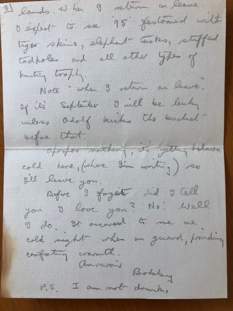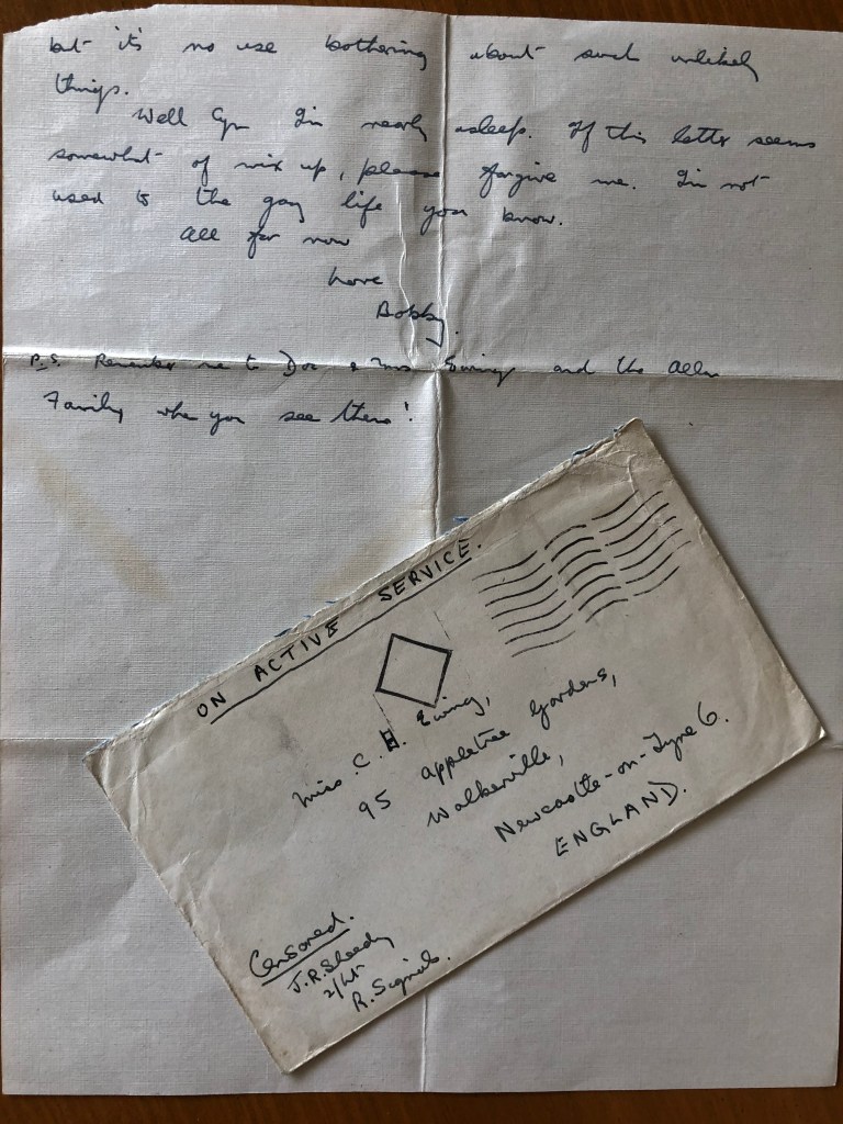 A year after the previous letter, Bobby is on a ship bound for an undisclosed destination. It must have been a difficult position for passengers- aware of the possible dangers from the enemy and weather, but unable to do anything about it. And not likely that they had the entertainments Cynthia had enjoyed two years previously on the Cunard ships! But it did give Bobby a glimpse of the wider world.