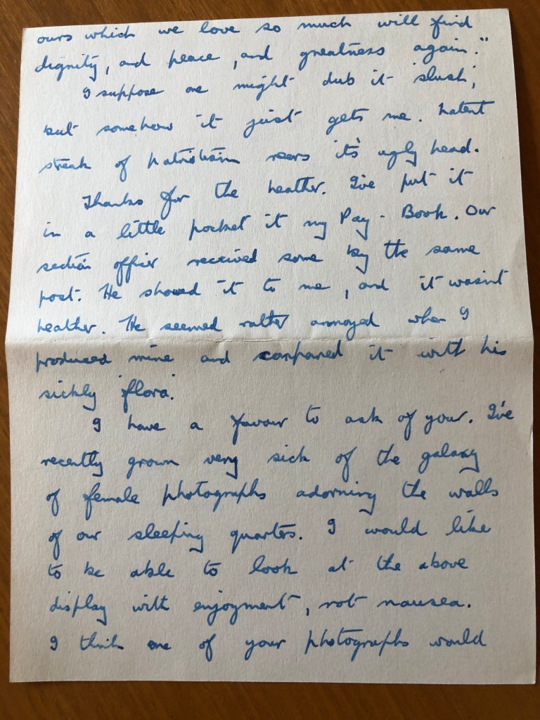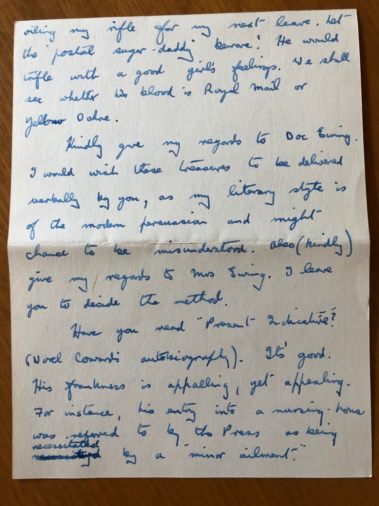 Incidentally, I meant to send off my Xmas cards, or perhaps I should say that I intended to buy some to send off, but I’ve been so terribly rushed that I haven’t yet got any. This letter may reach you at Xmas or later, so please accept these my best wishes for a normal happy Xmas and loads of fun at New Year. God, how I wish I could be home for it all but it’s no use bothering about such unlikely things.