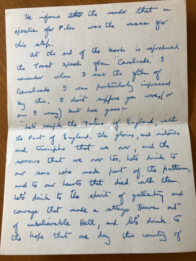 One morning, I was in Barclays Bank to cash a cheque, and after signing the naval forms applicable, I was standing in a corner of the bank waiting to see the Sub Manager. I turned round and immediately saw a fellow who was at school with me. His name is Woll; I don’t know whether you know him. The last time I saw him was at the Old Assembly Rooms, when I was there at a dance on my Embarkation Leave. I won’t say “It’s a …… world”, but you know what I mean.
